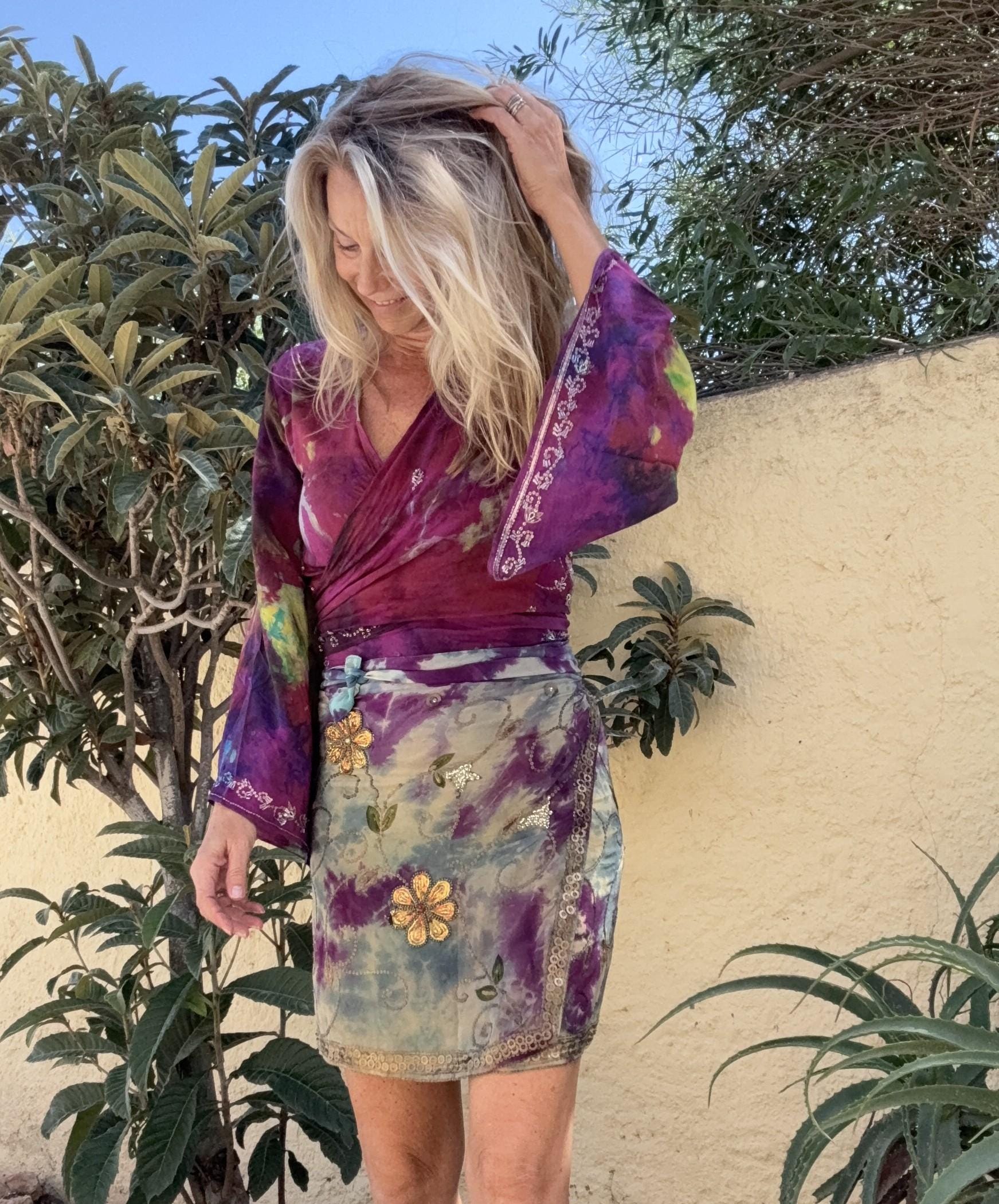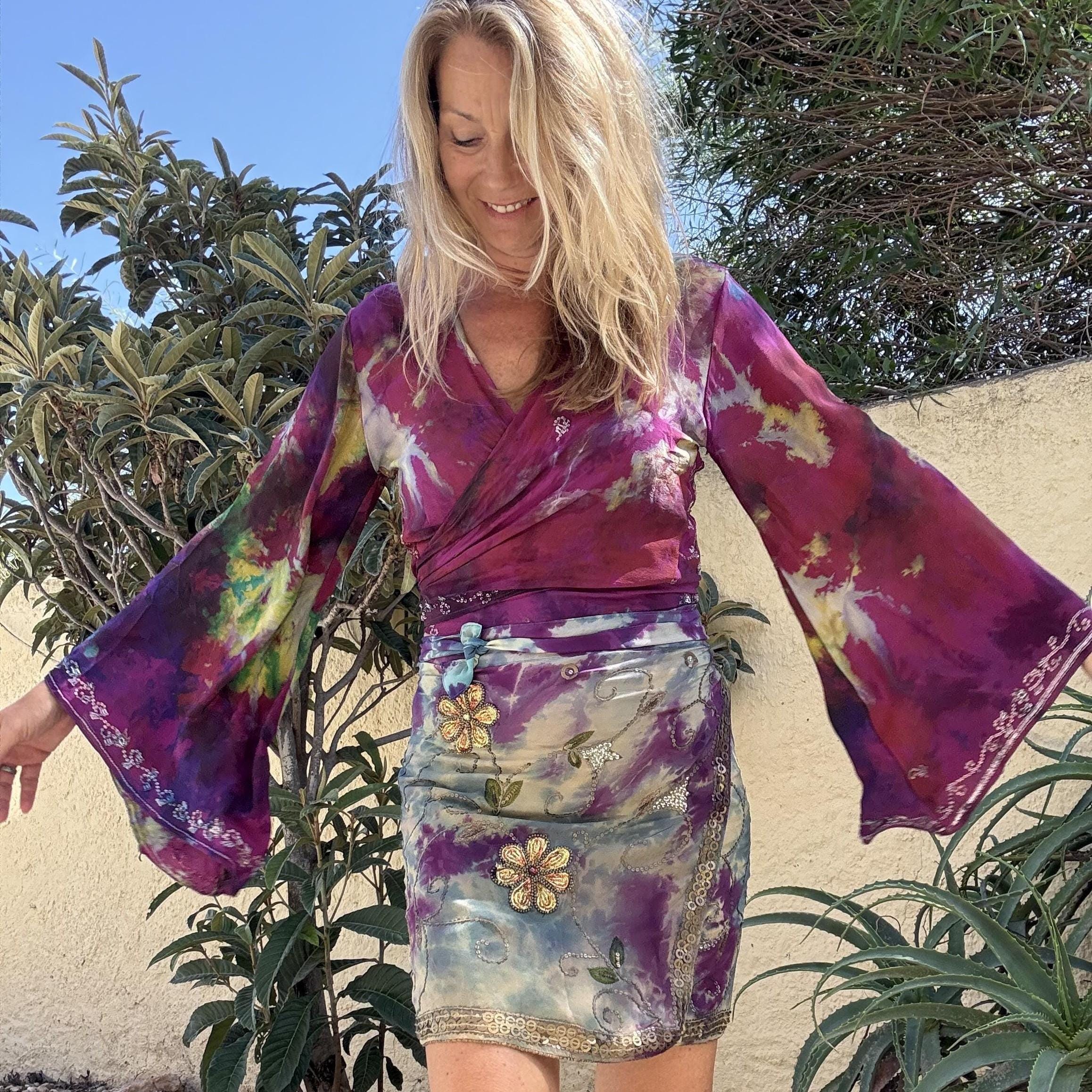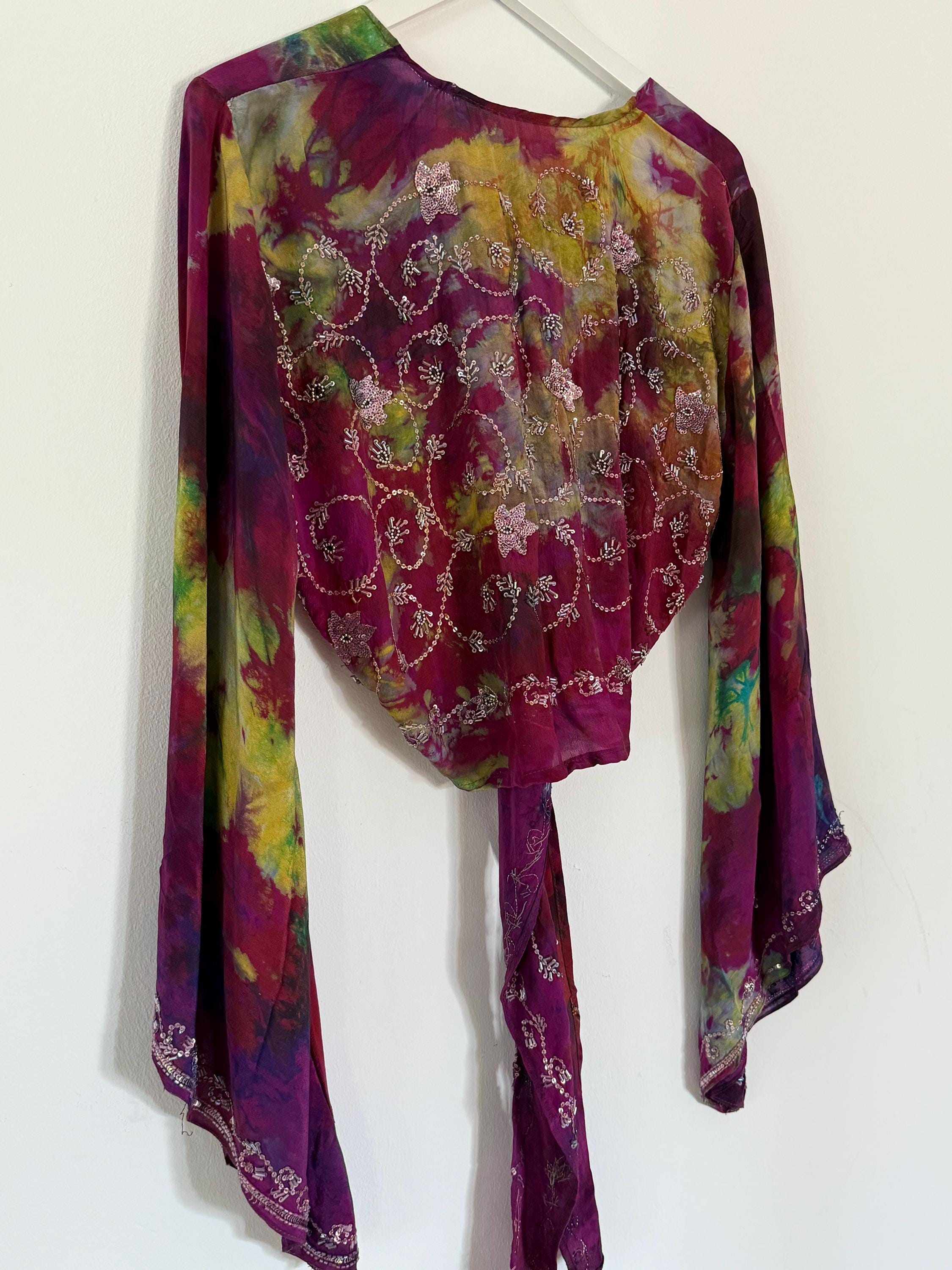 Handmade recycled Sari wrap top with bell sleeves with lots of sequins and embellishments Dress it up with on a dress, or dress it down on a jeans, depending on the occasion.
