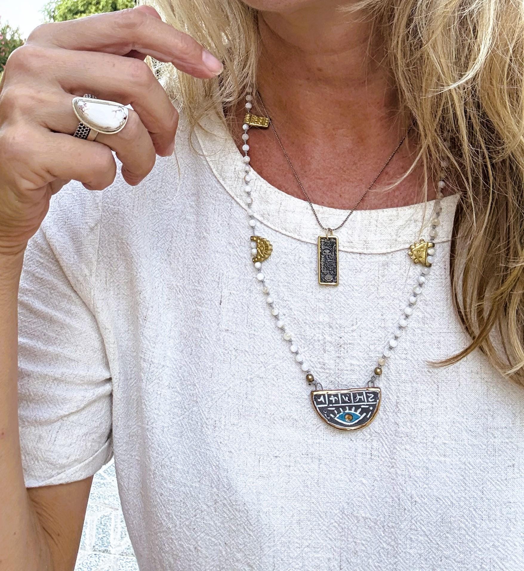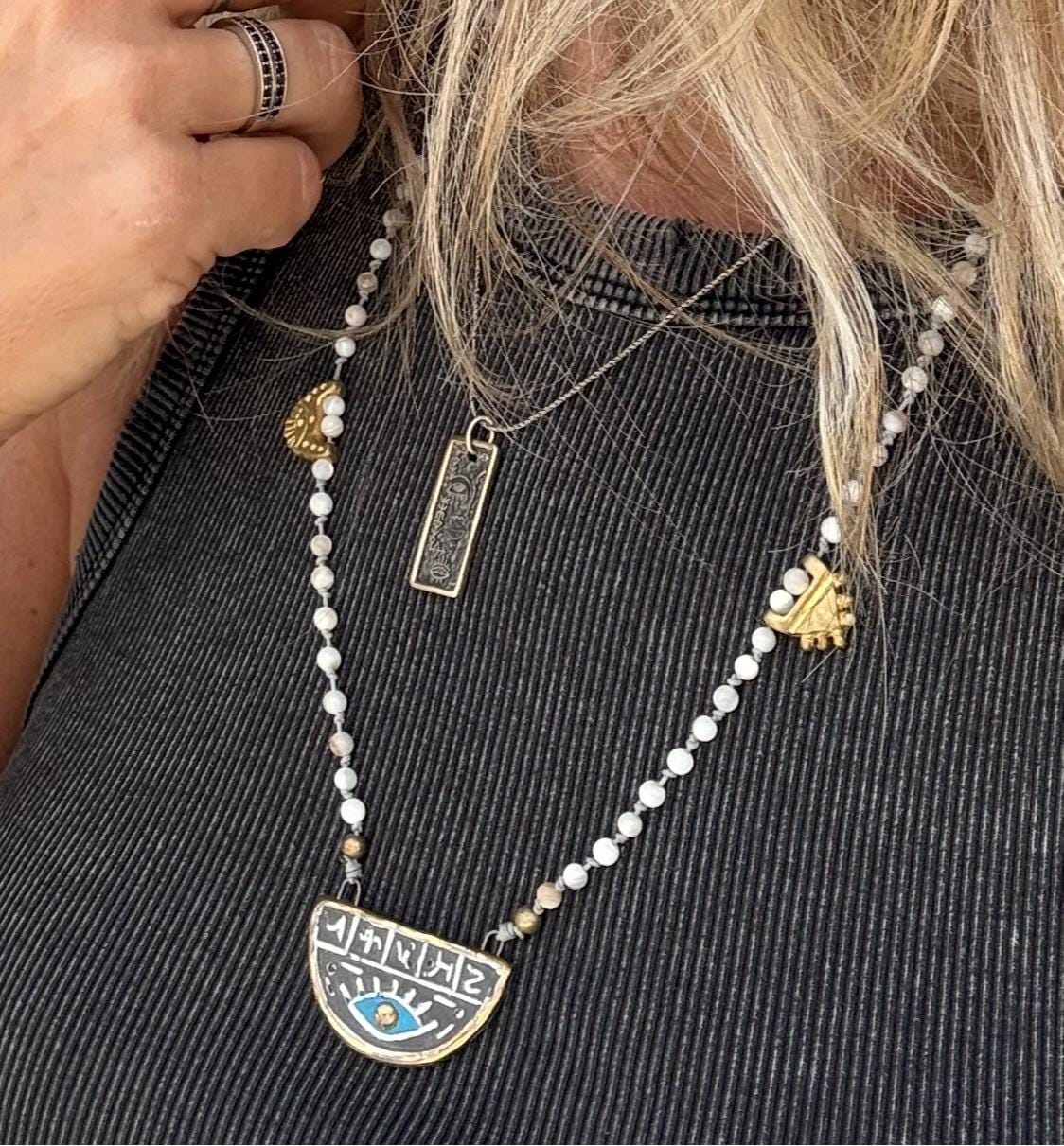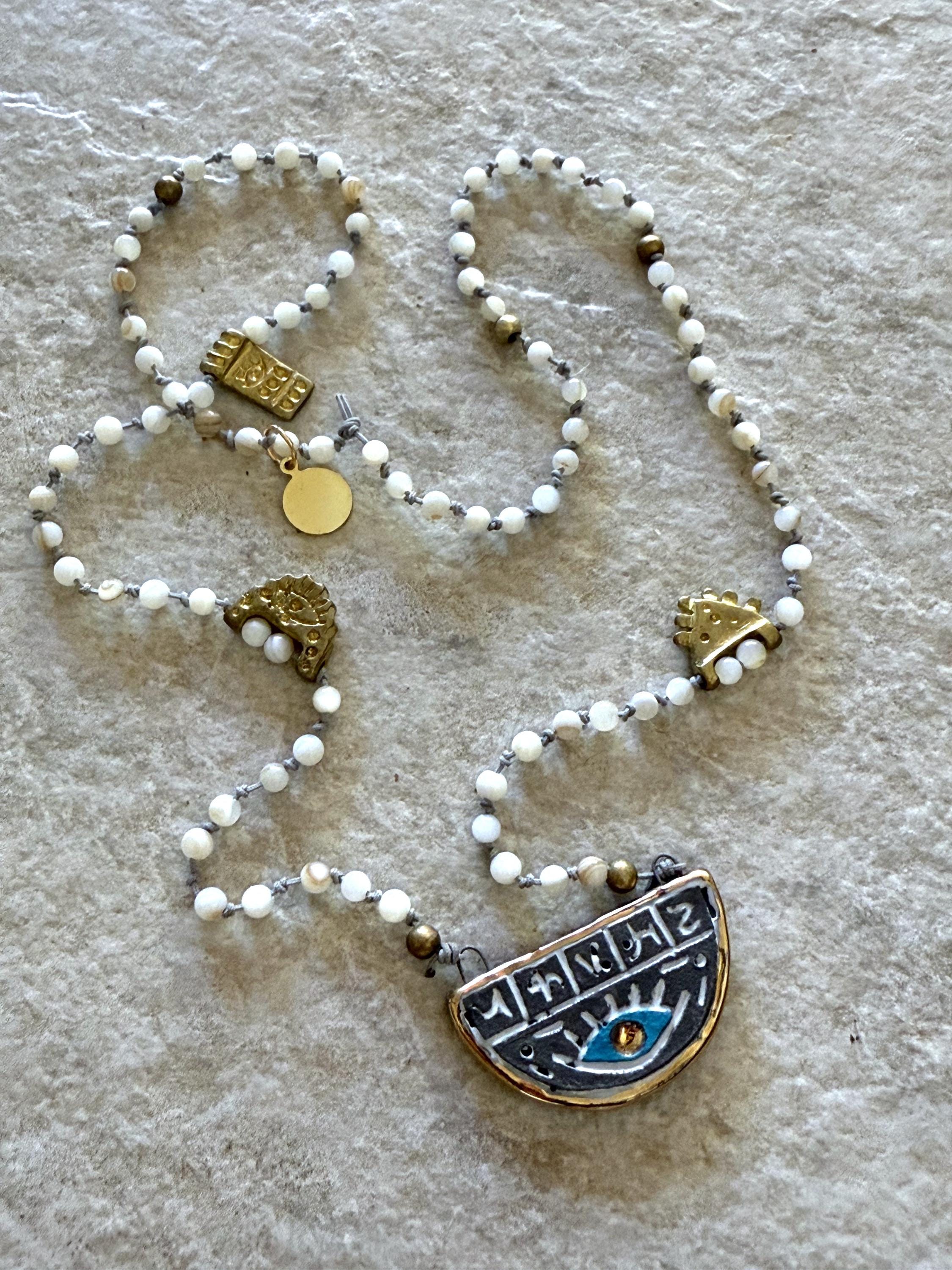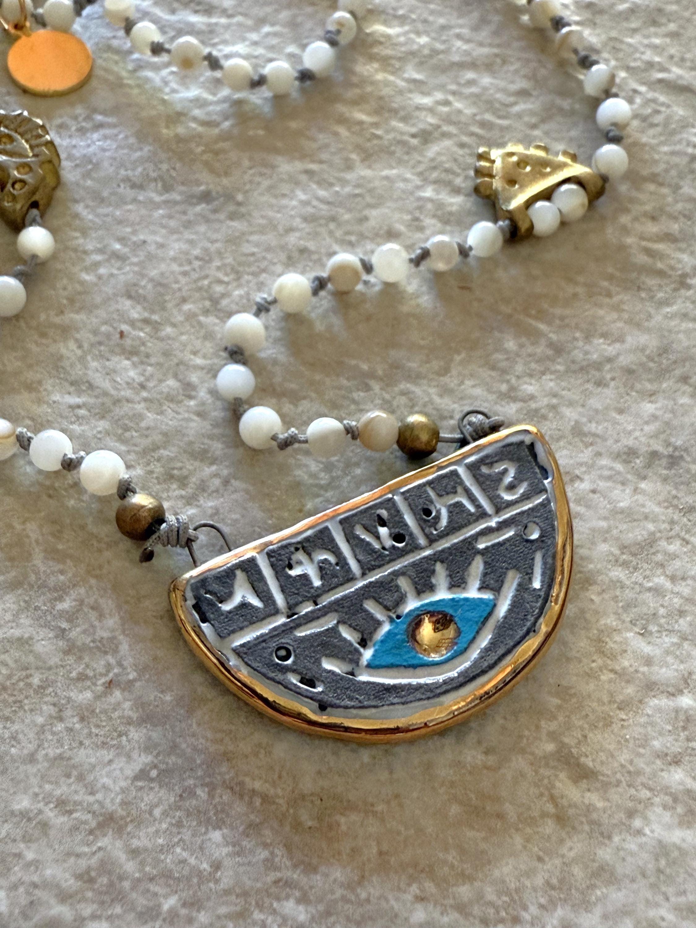 Bring meaning and artistry into your everyday style with this handmade prayer necklace, carefully crafted by artisans in Ankara, Turkey. This unique piece combines glass beads, a striking ceramic amulet, and delicate bronze details, creating a design that is both spiritual and stylish.