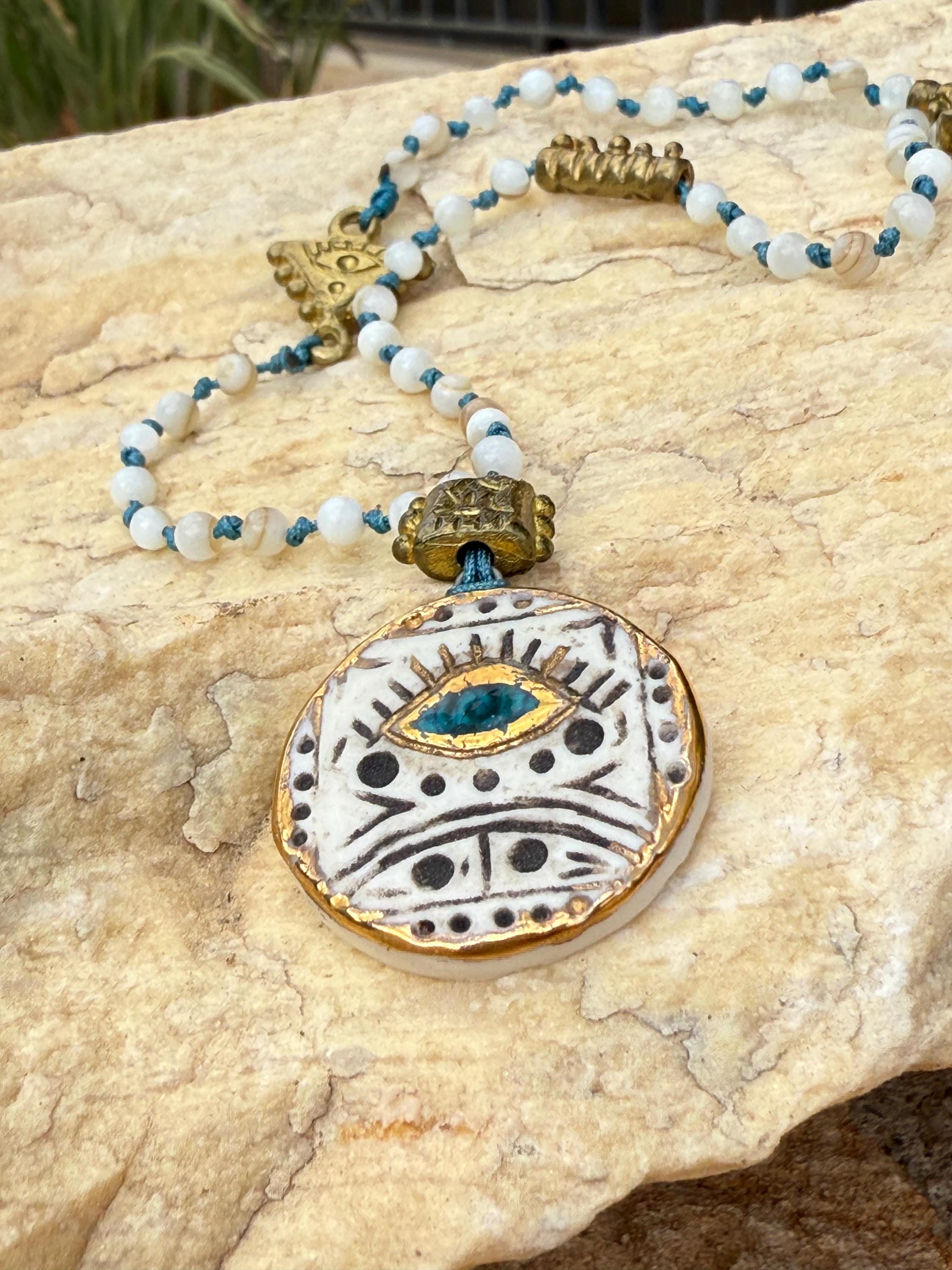 Bring meaning and artistry into your everyday style with this handmade prayer necklace, carefully crafted by artisans in Ankara, Turkey. This unique piece combines glass beads, a striking ceramic amulet, and delicate bronze details, creating a design that is both spiritual and stylish.