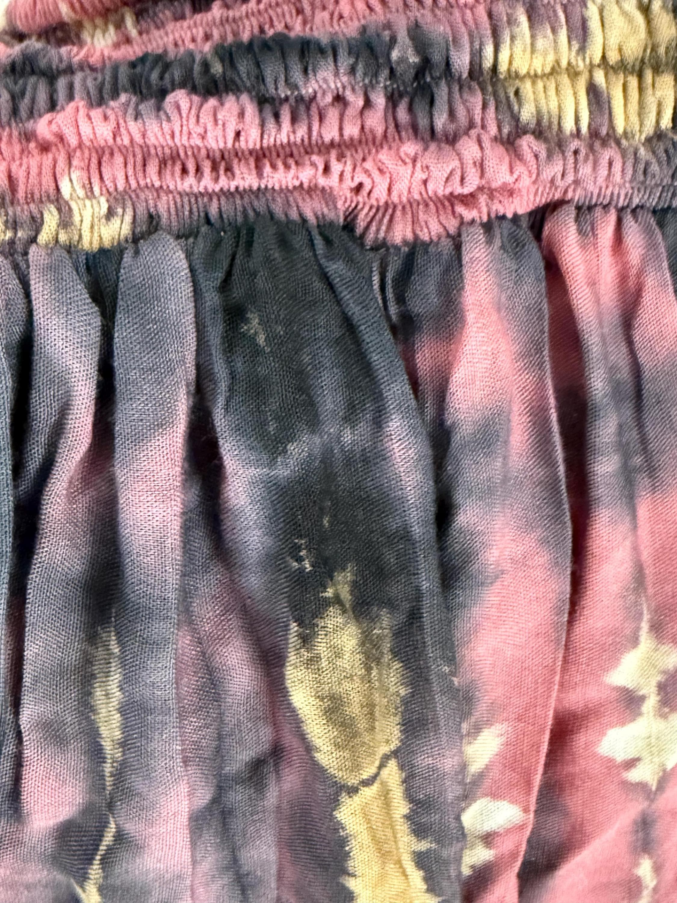 The elastic back waistband ensures a comfortable, flexible fit that adapts to your shape, while the hand-dyed tie-dye pattern makes every piece one-of-a-kind.