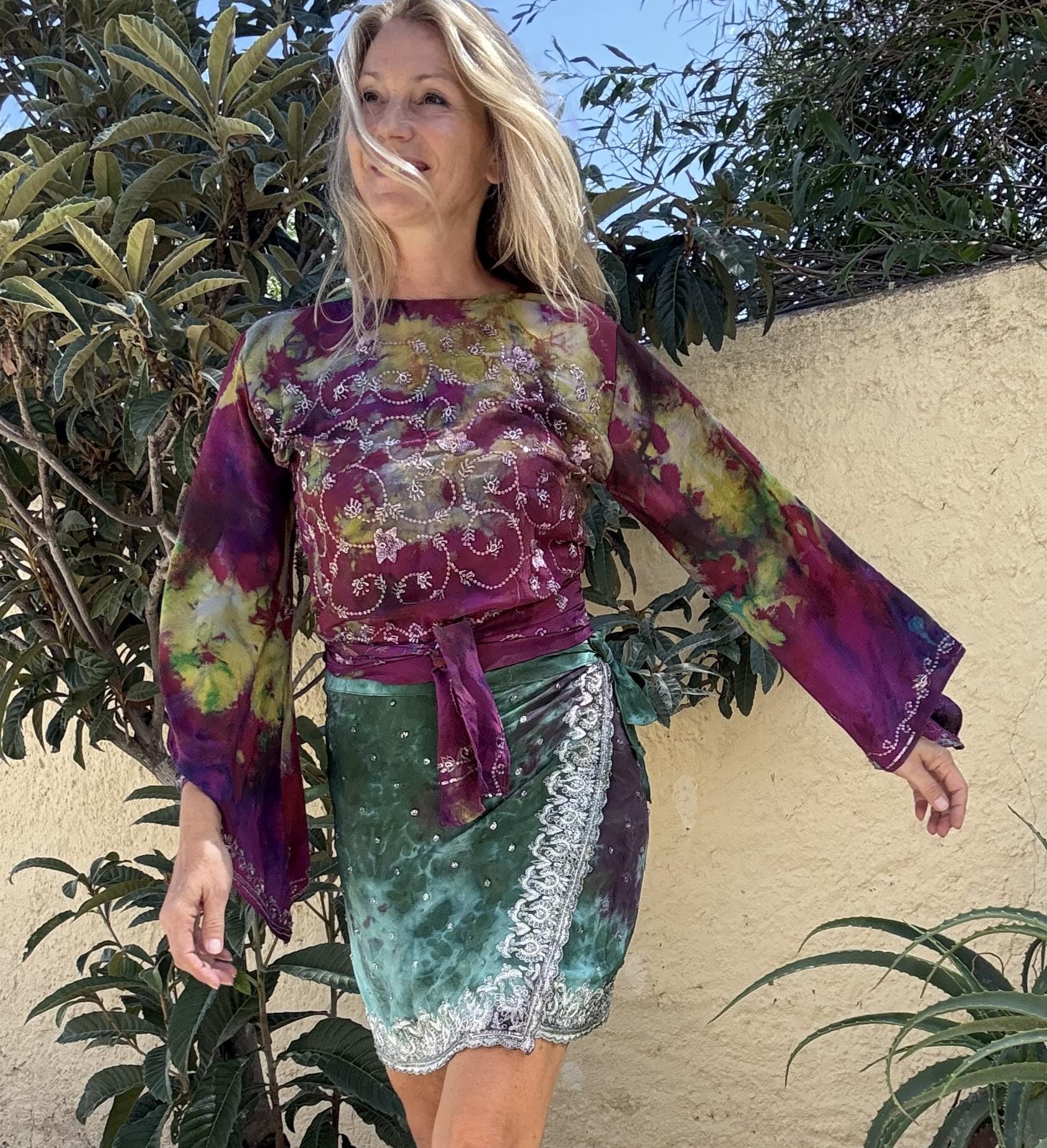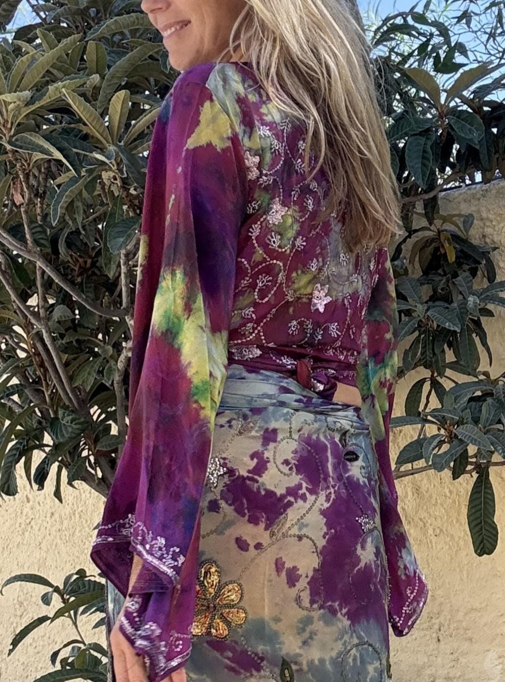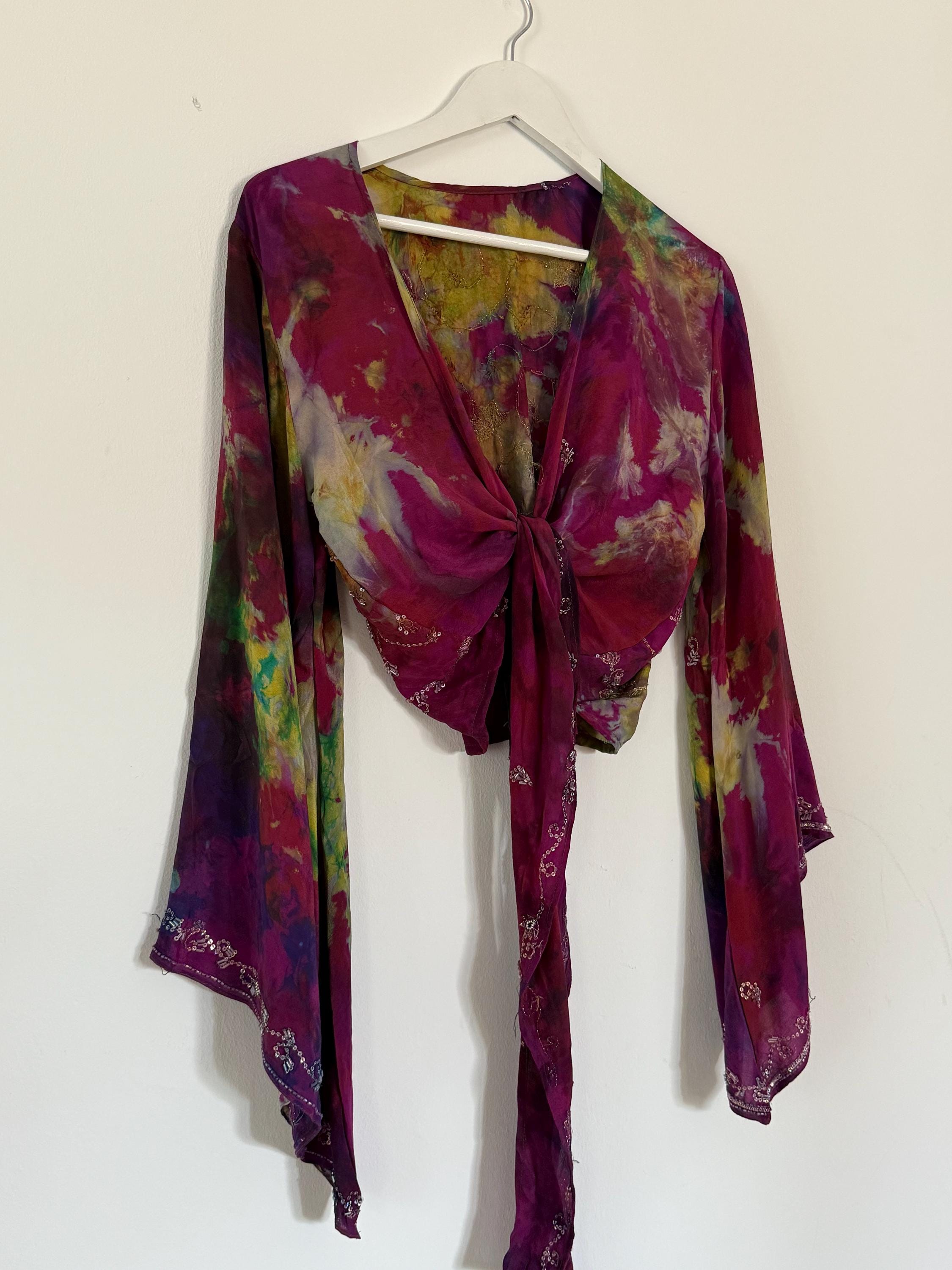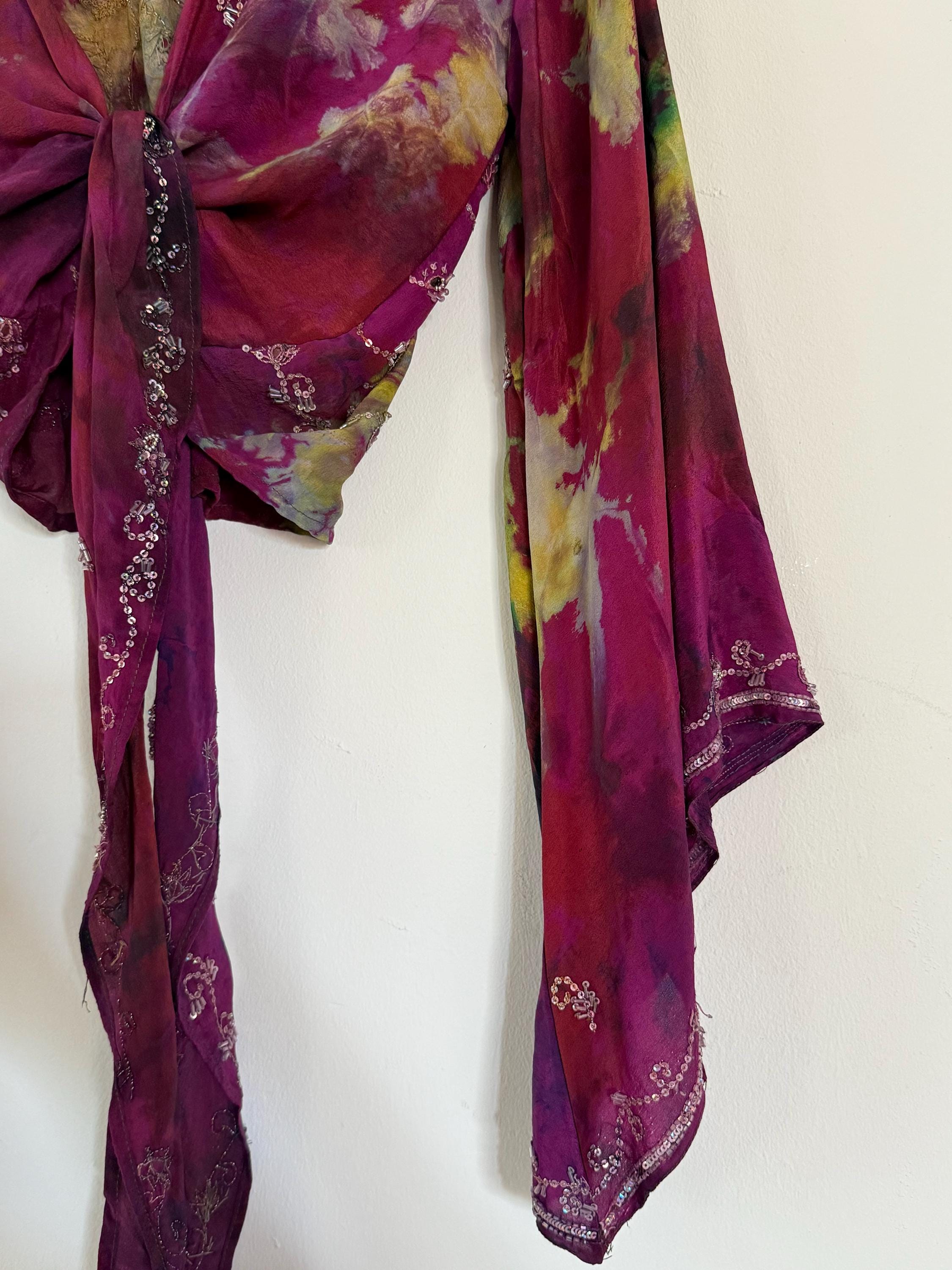 Handmade recycled Sari wrap top with bell sleeves with lots of sequins and embellishments Dress it up with on a dress, or dress it down on a jeans, depending on the occasion.