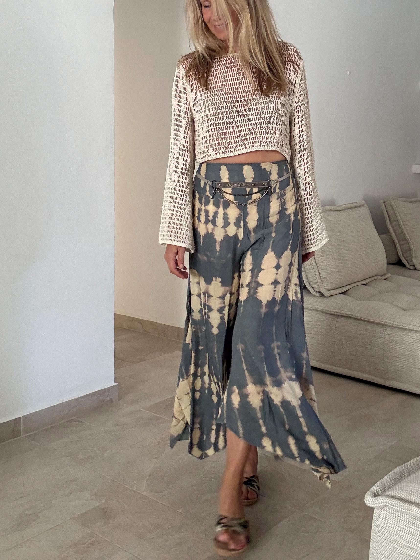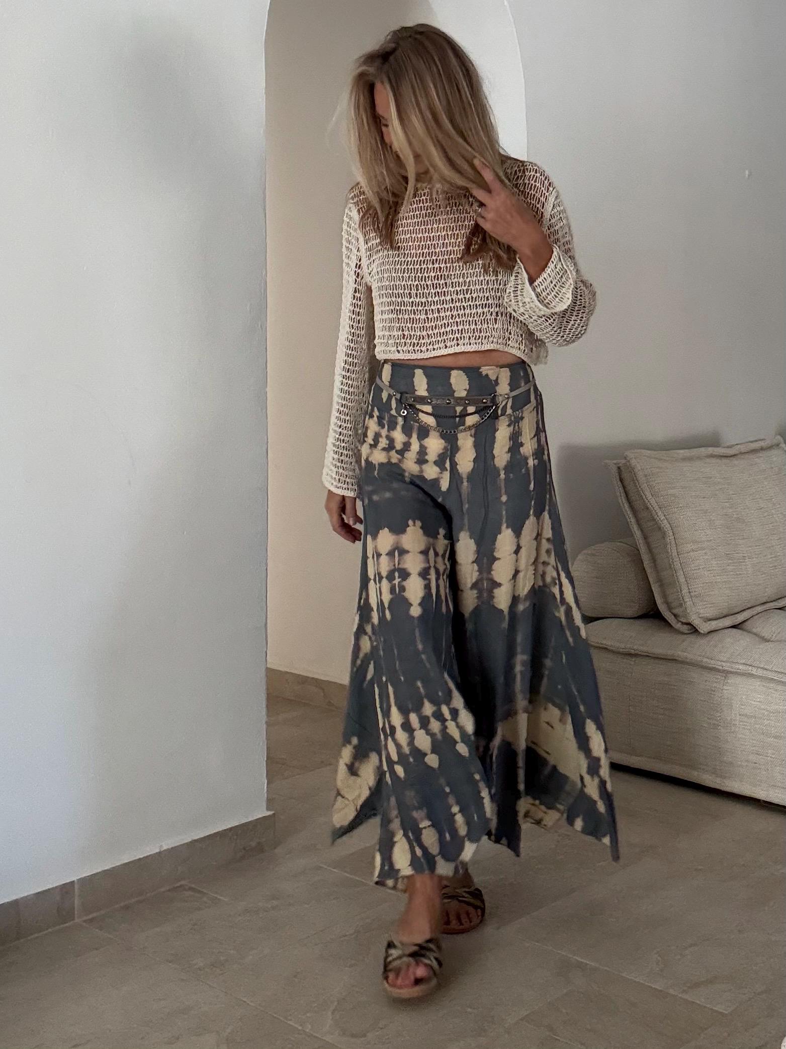 Step into effortless boho style with these unique tie-dye pants, designed for comfort and individuality. Made from soft, breathable cotton, they feature wide asymmetric legs with a playful split that flows beautifully as you move – perfect for festivals, beach days, or everyday bohemian living.