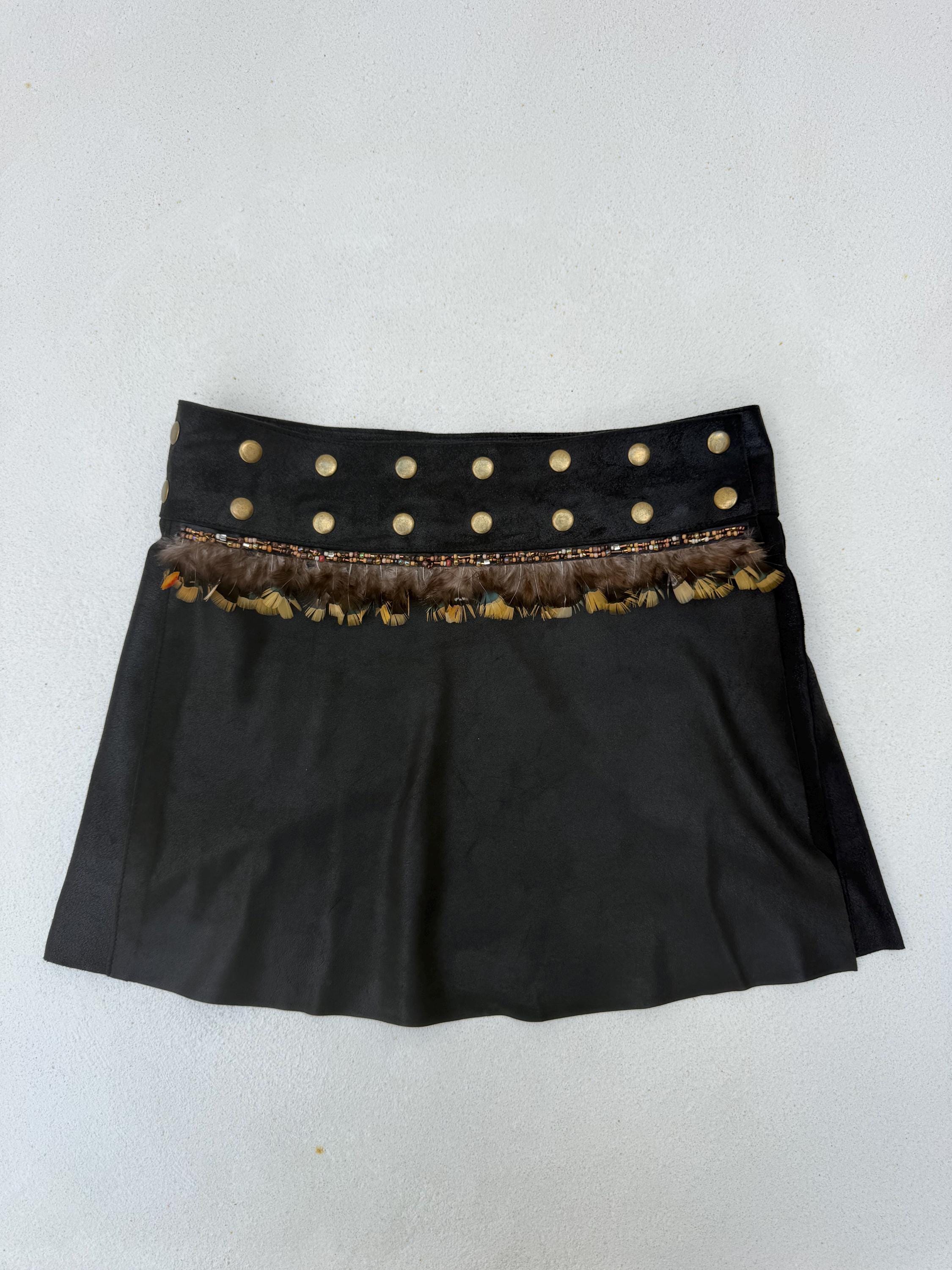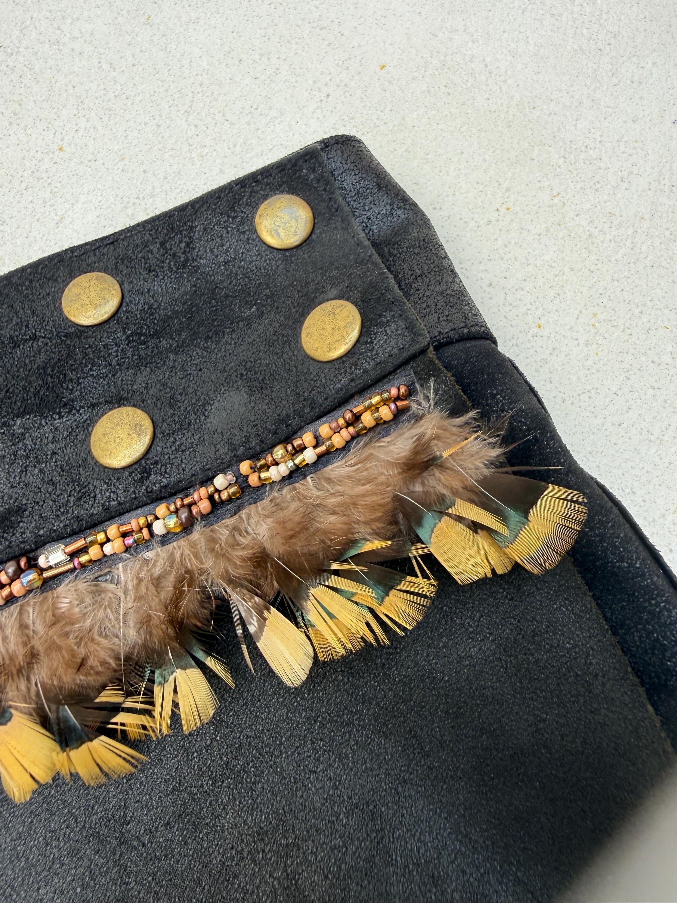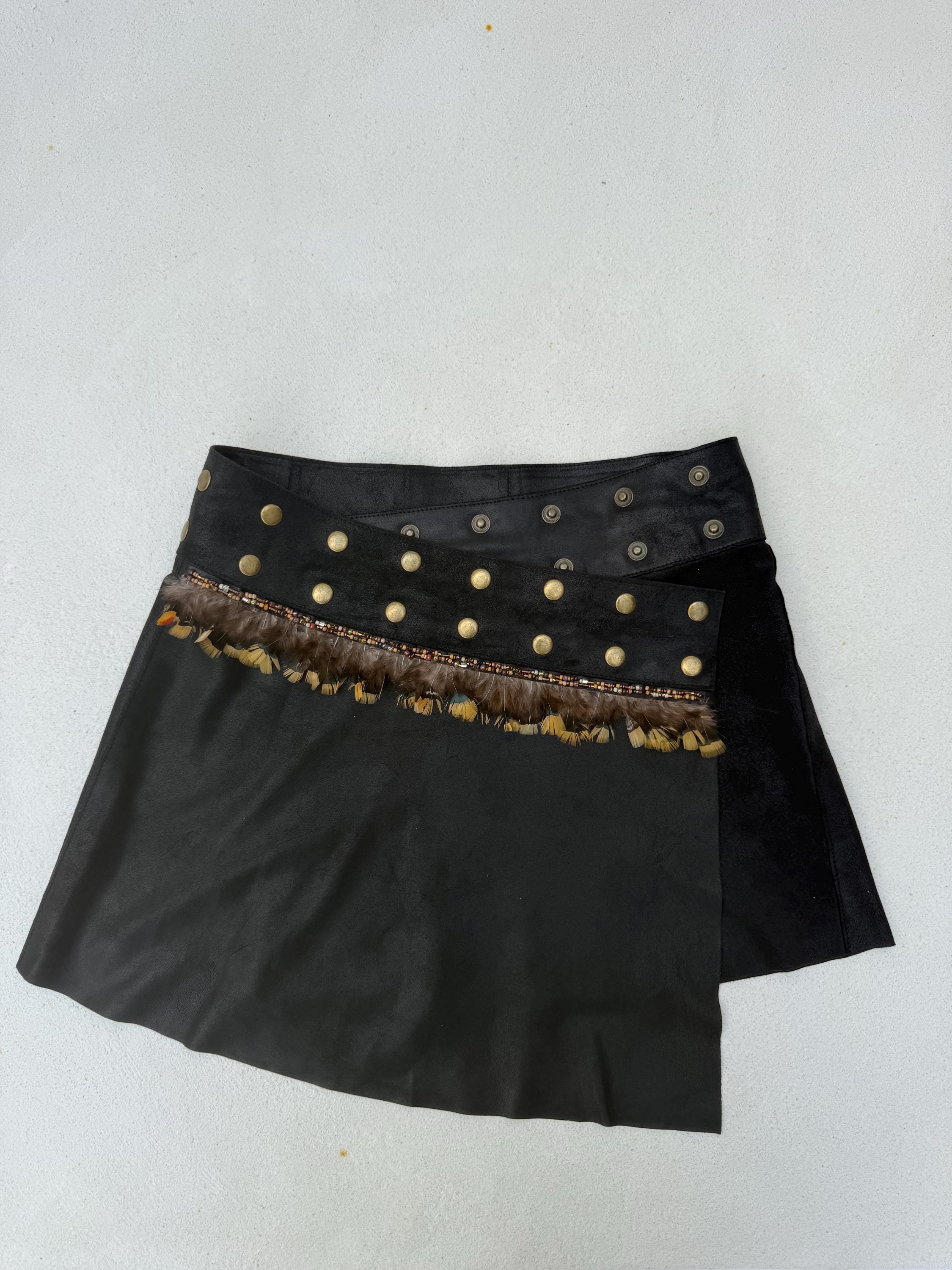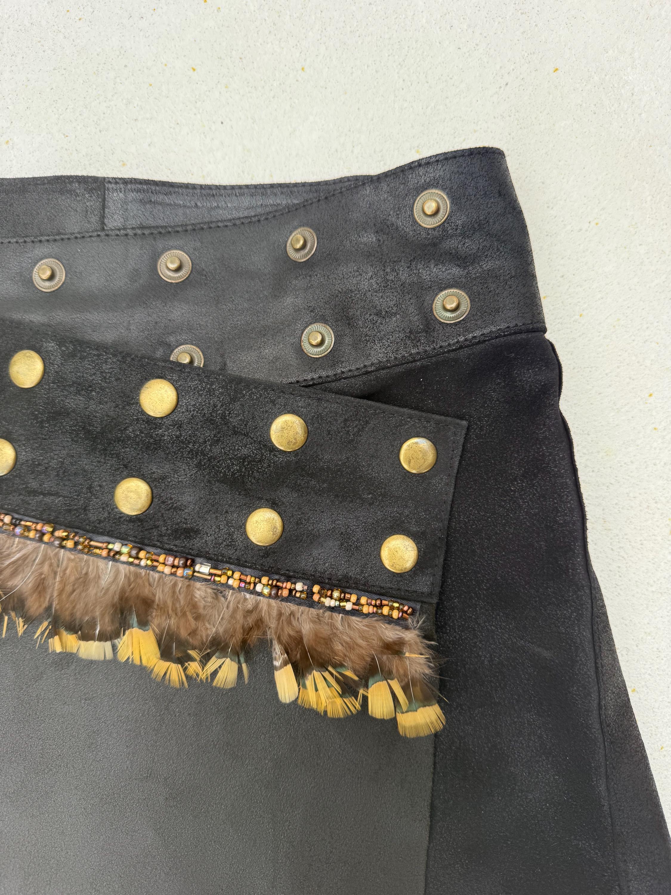 Savage Bloom is made of a curated butter soft leather wrap skirt, hand transformed with beads and real feathers. It closes with adjustable snaps so will fit any size.