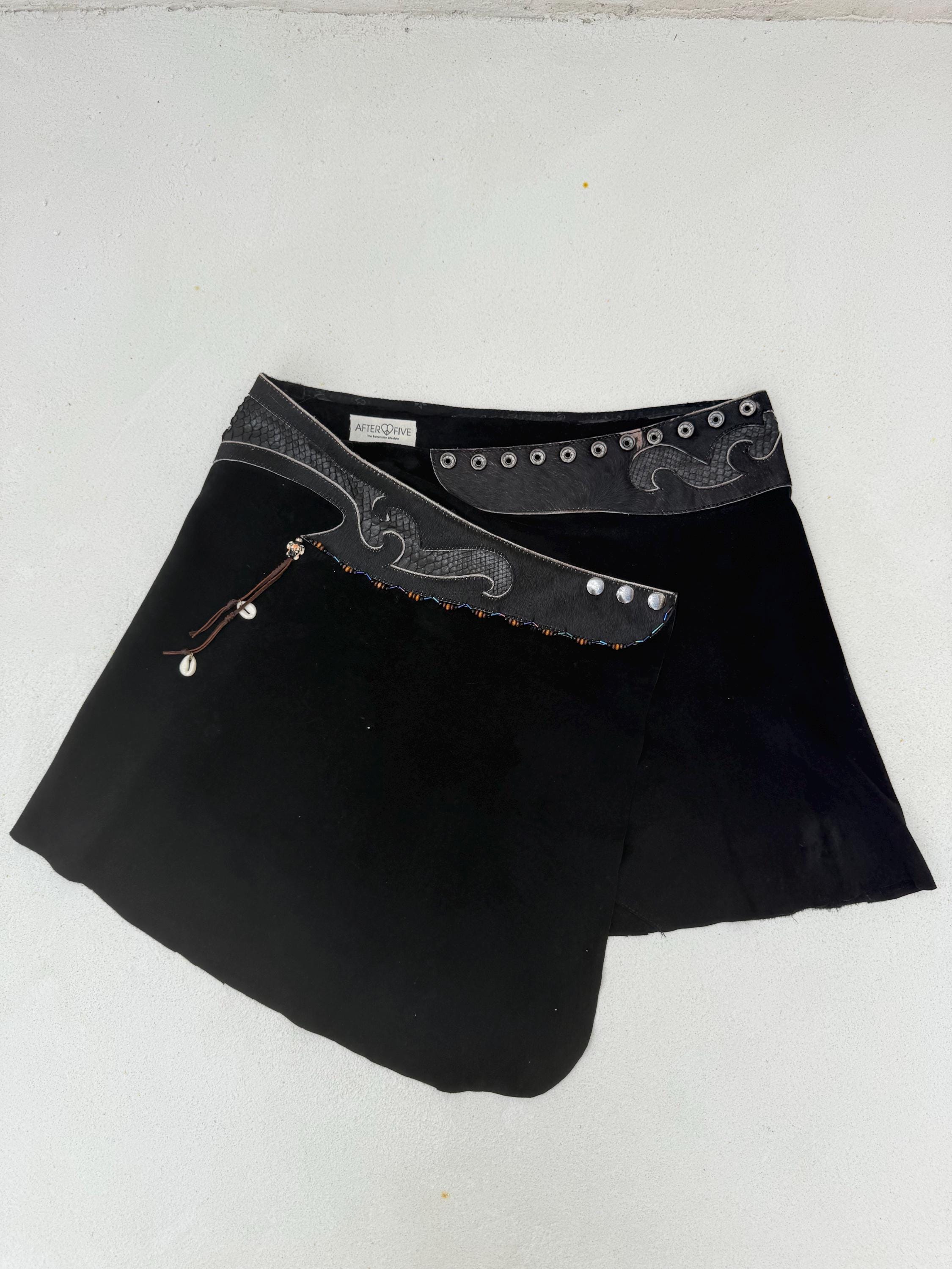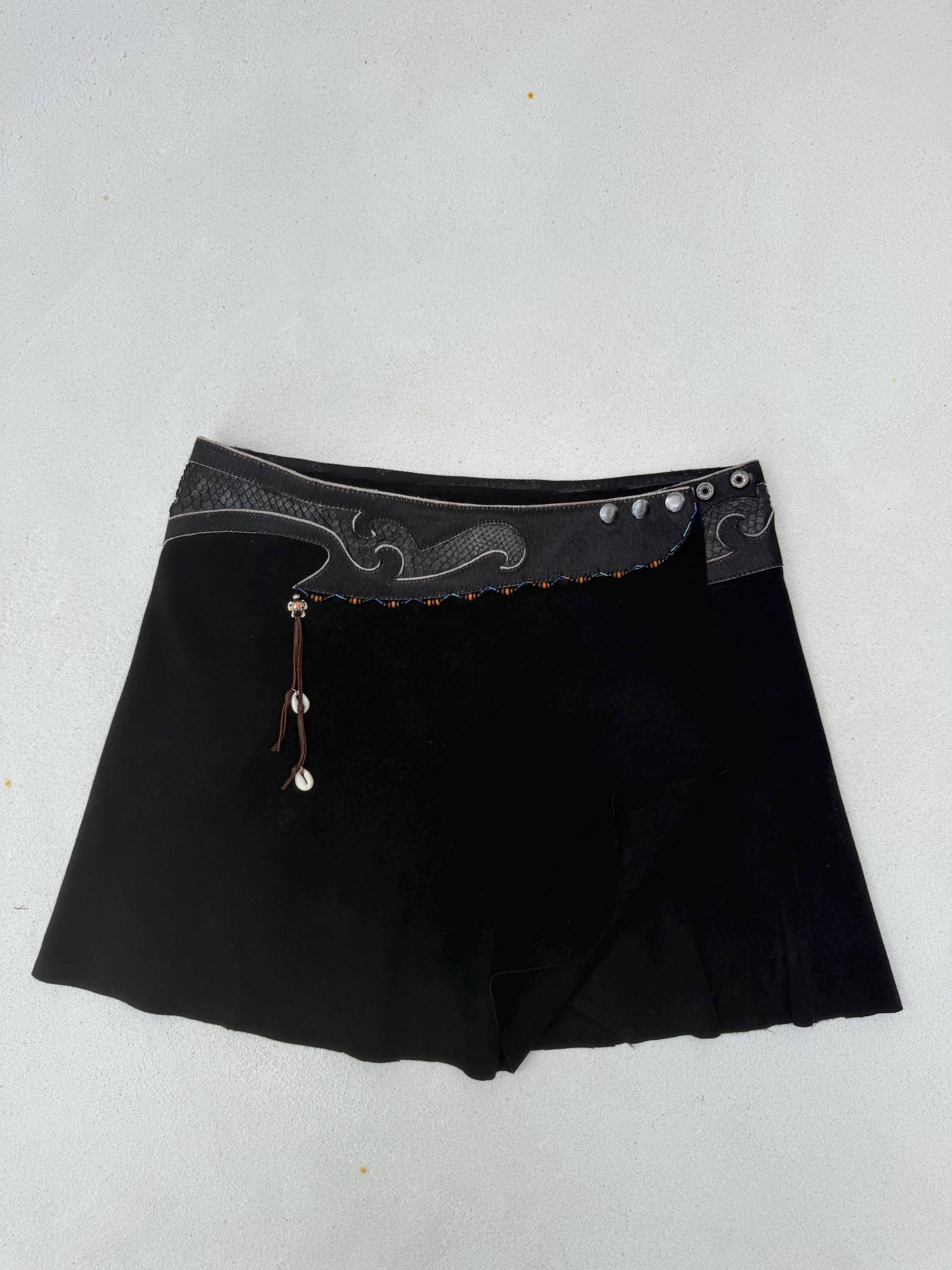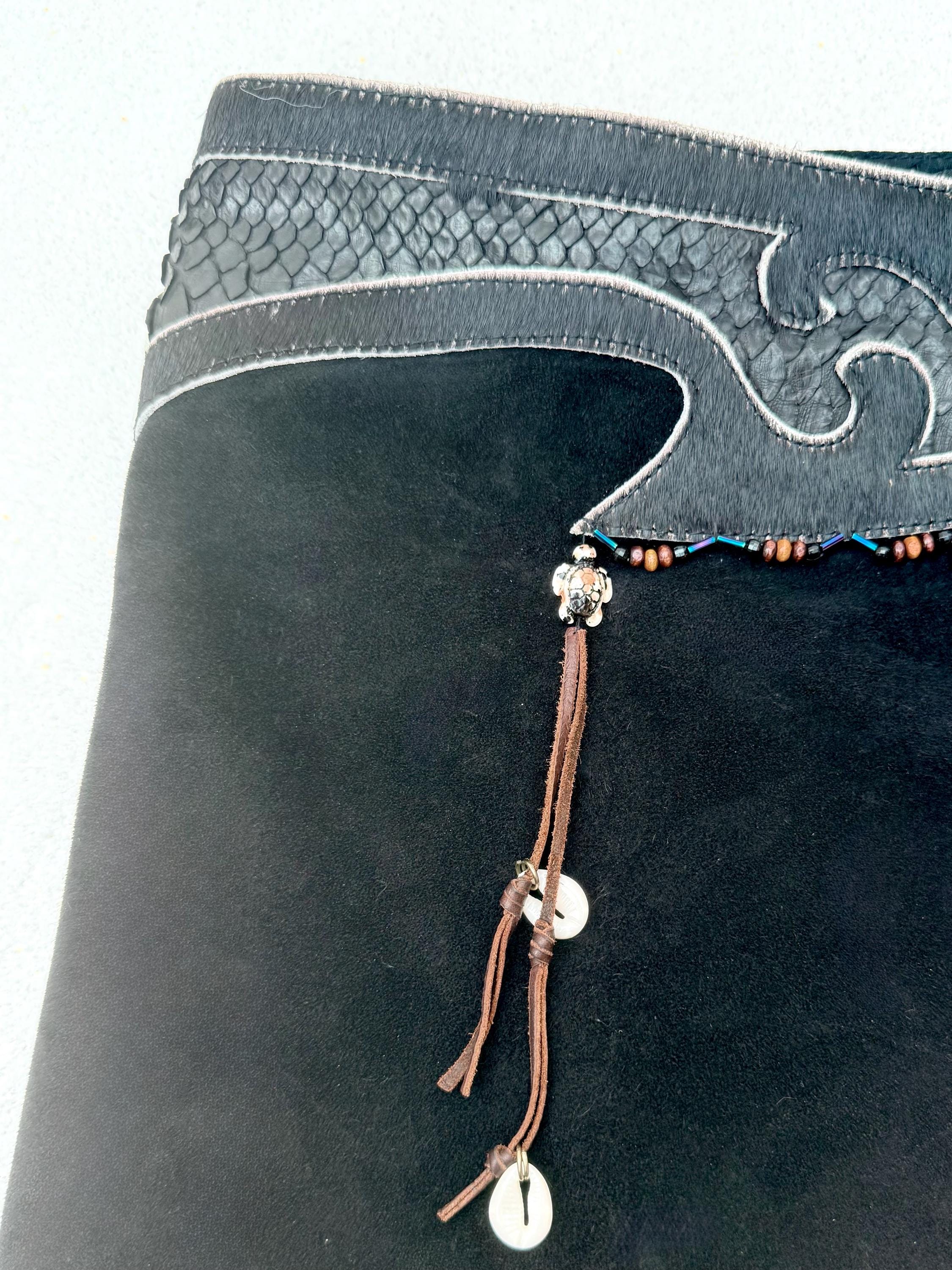 A striking black suede skirt infused with oceanic mystique and untamed craftsmanship. The sculpted waistband flows in wave-like curves, crafted from rich leather snakeskin and real ponyhair for a bold, textural contrast. Shimmering oily-toned beads catch the light with every movement, while a delicate amulet — featuring a turtle and cowrie shell on a brown leather string — adds a touch of symbolism and wanderer spirit. Tidal Serpent is a one-of-a-kind statement piece, designed for those who embrace the rhythm of nature, the mystery of the sea, and fearless self-expression.