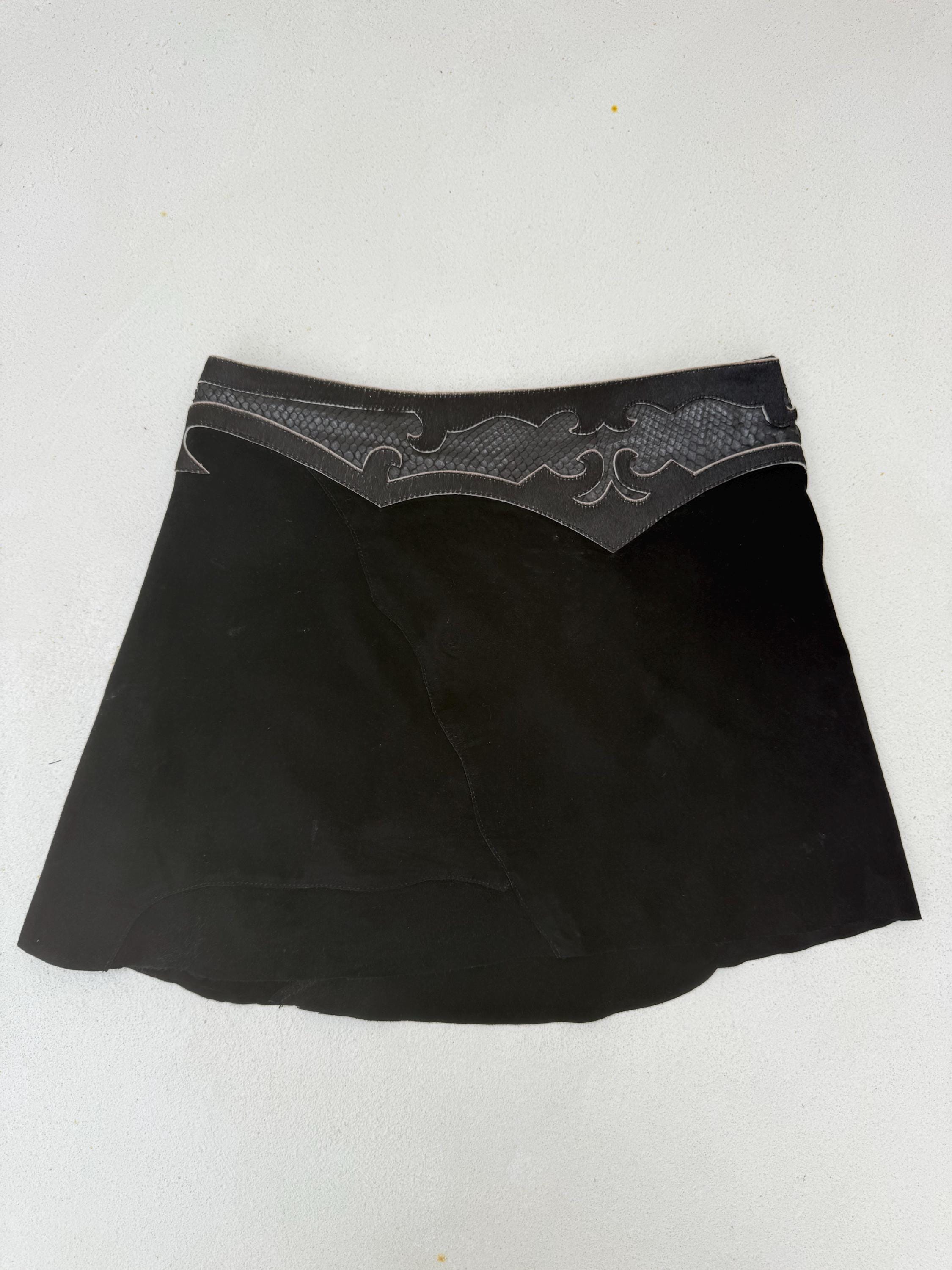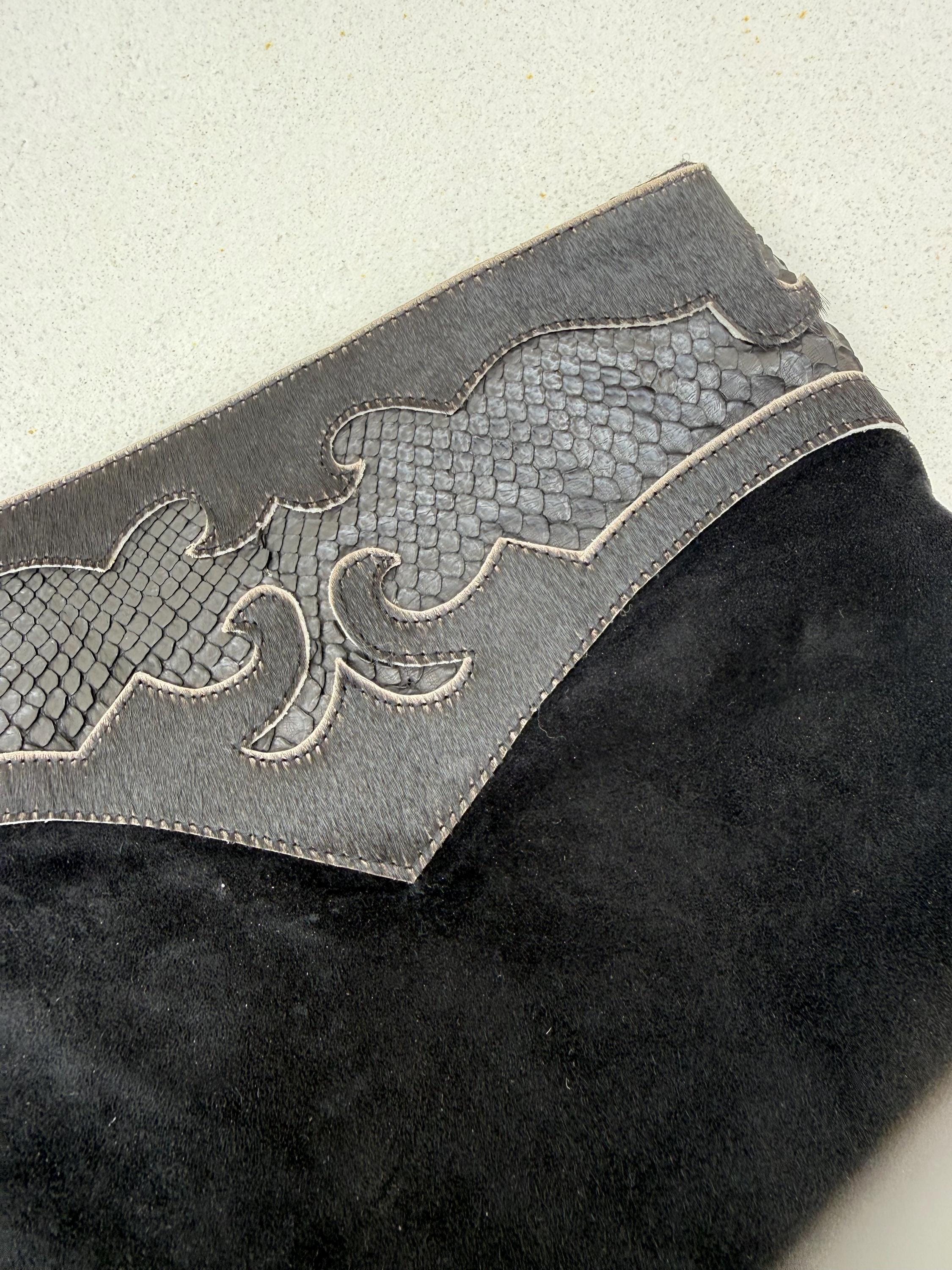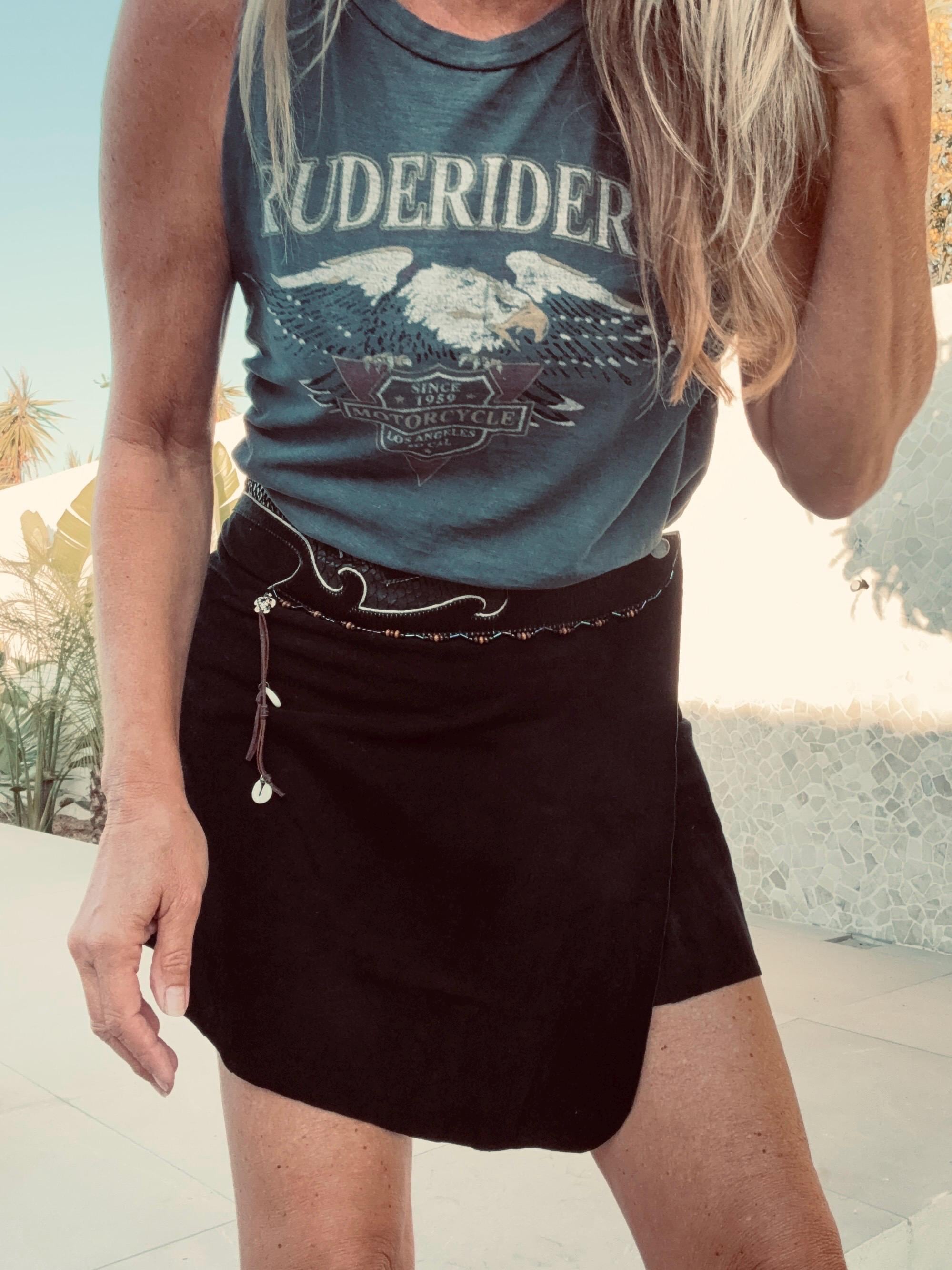 A striking black suede skirt infused with oceanic mystique and untamed craftsmanship. The sculpted waistband flows in wave-like curves, crafted from rich leather snakeskin and real ponyhair for a bold, textural contrast. Shimmering oily-toned beads catch the light with every movement, while a delicate amulet — featuring a turtle and cowrie shell on a brown leather string — adds a touch of symbolism and wanderer spirit. Tidal Serpent is a one-of-a-kind statement piece, designed for those who embrace the rhythm of nature, the mystery of the sea, and fearless self-expression.