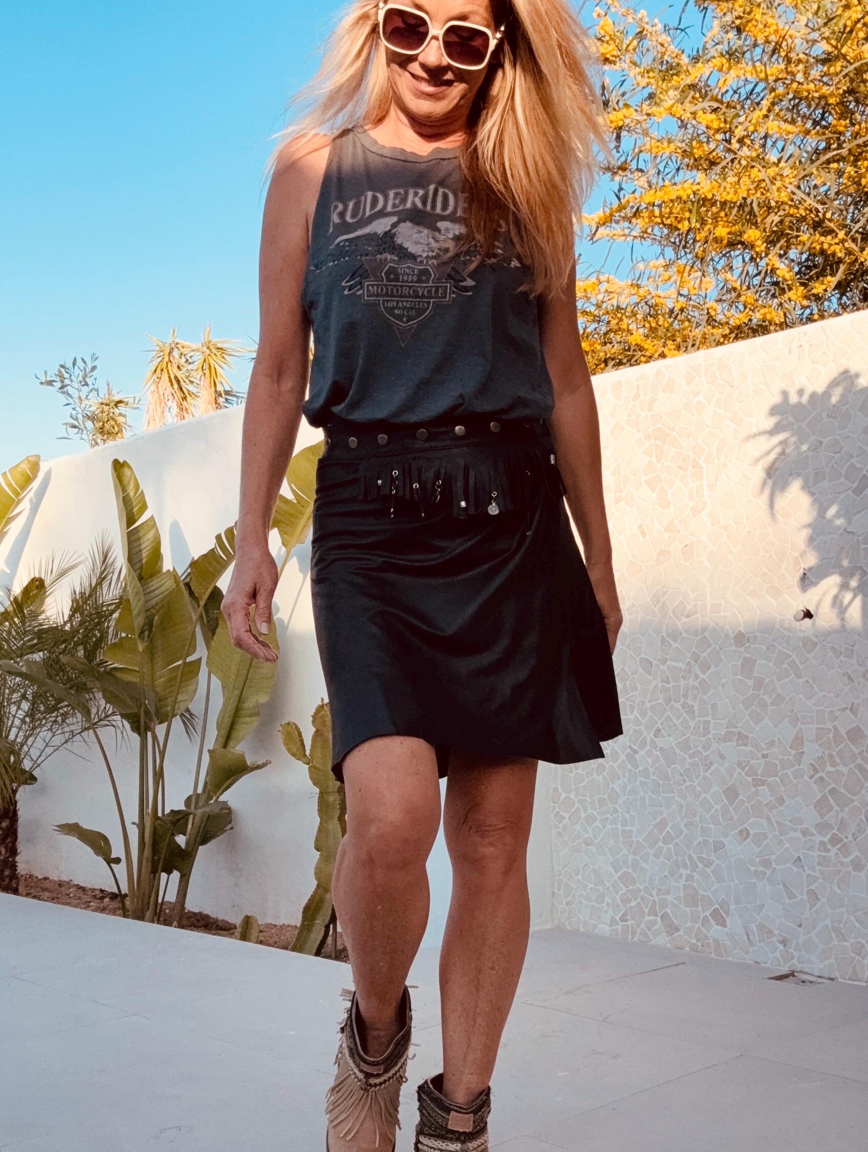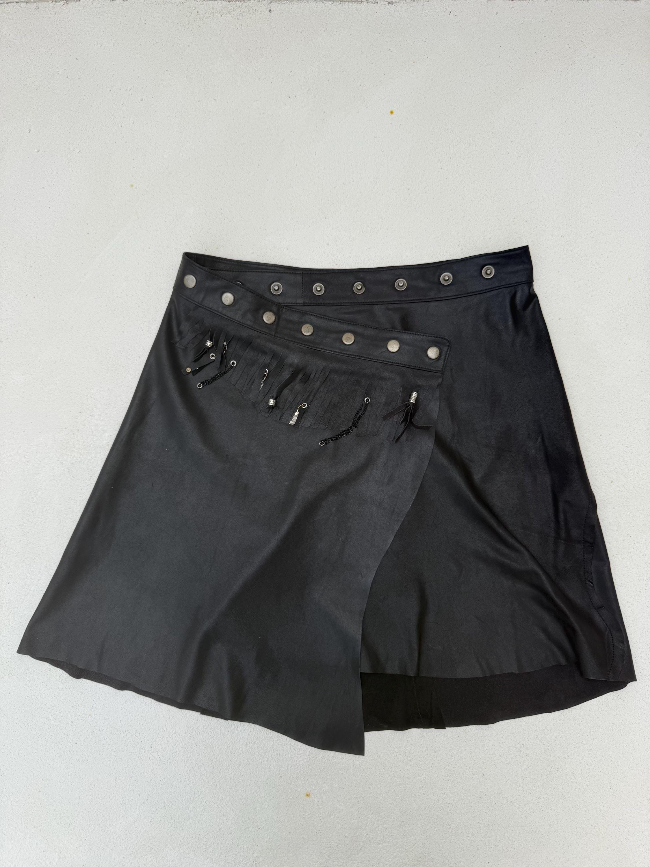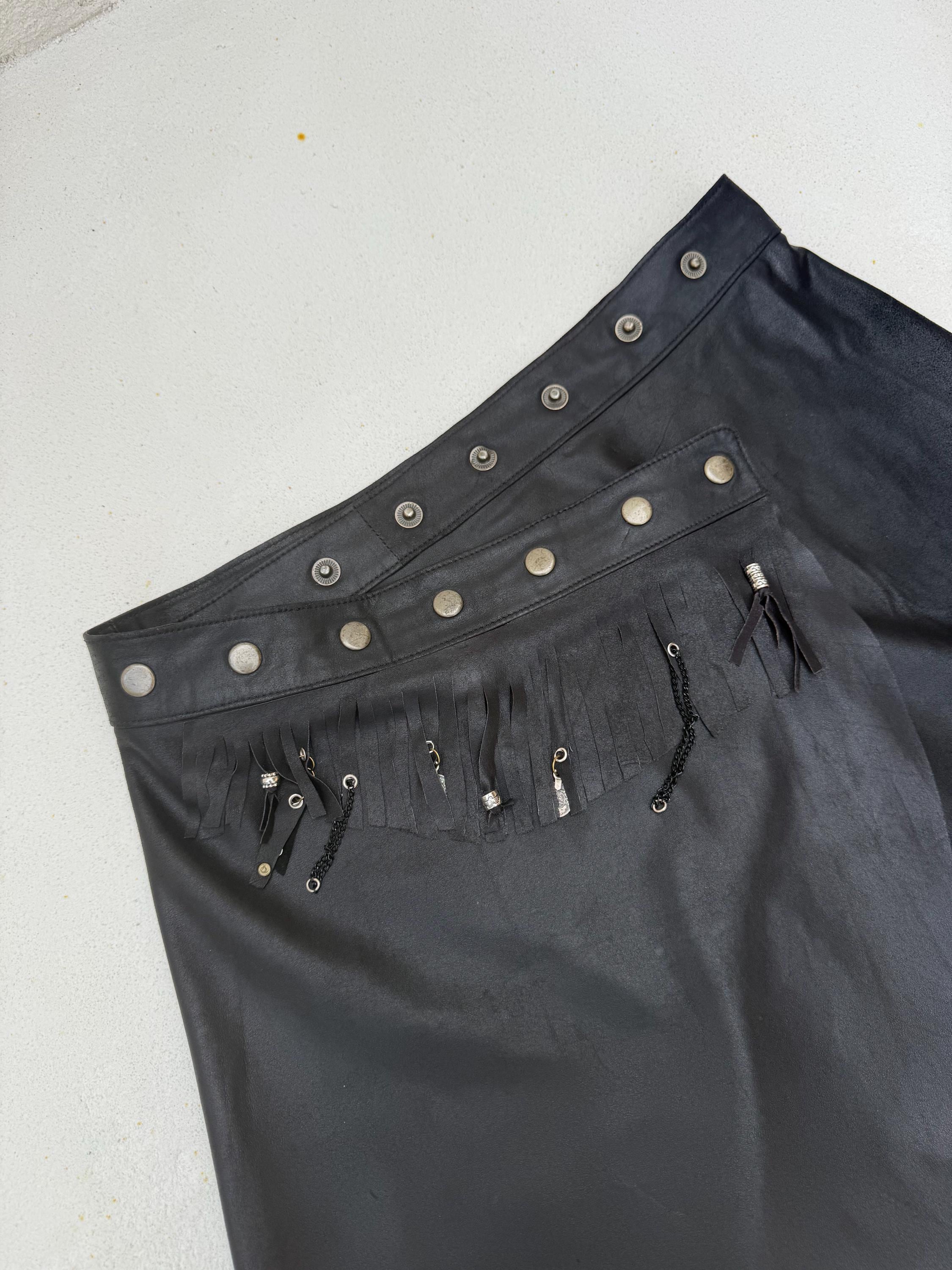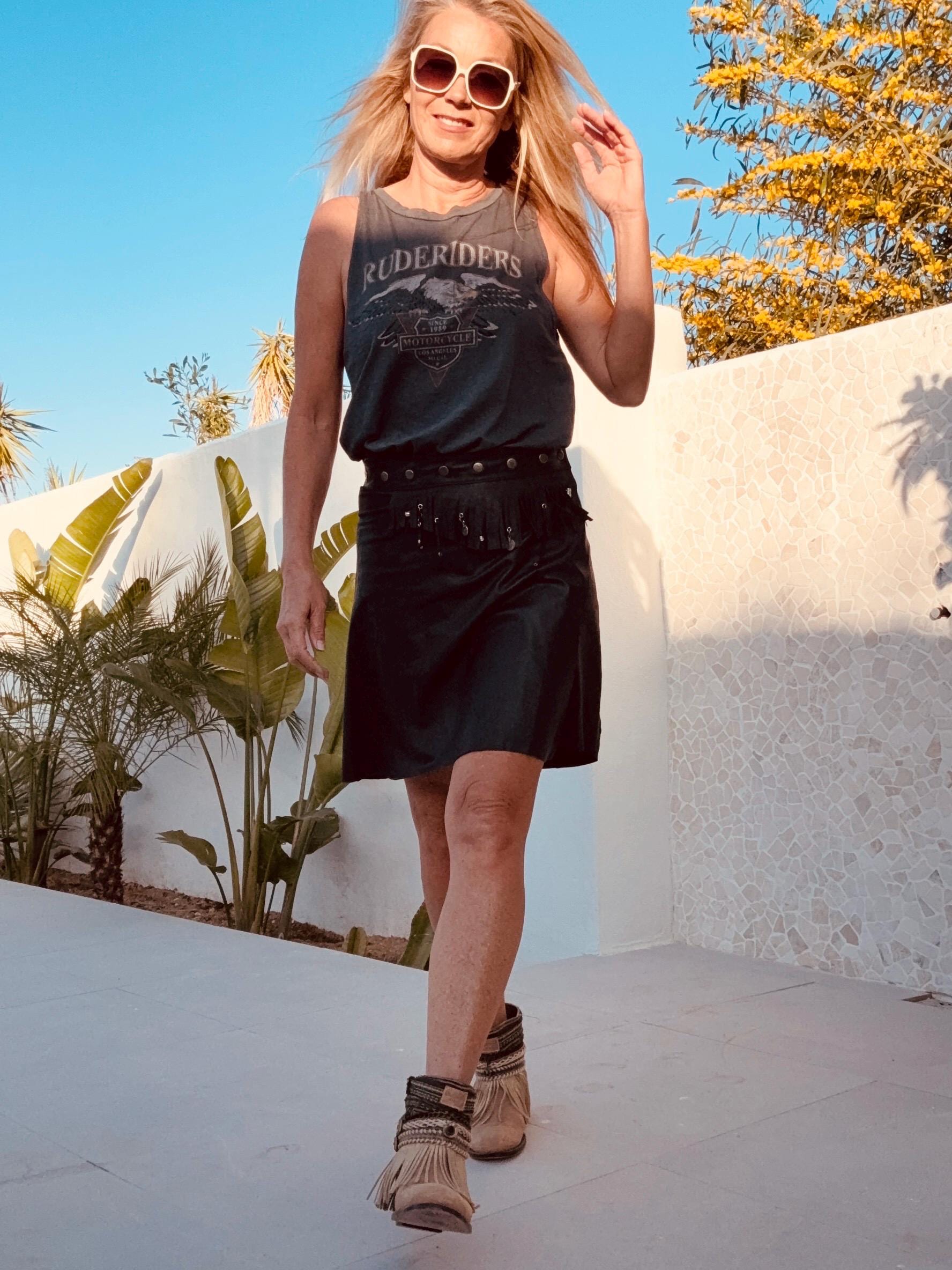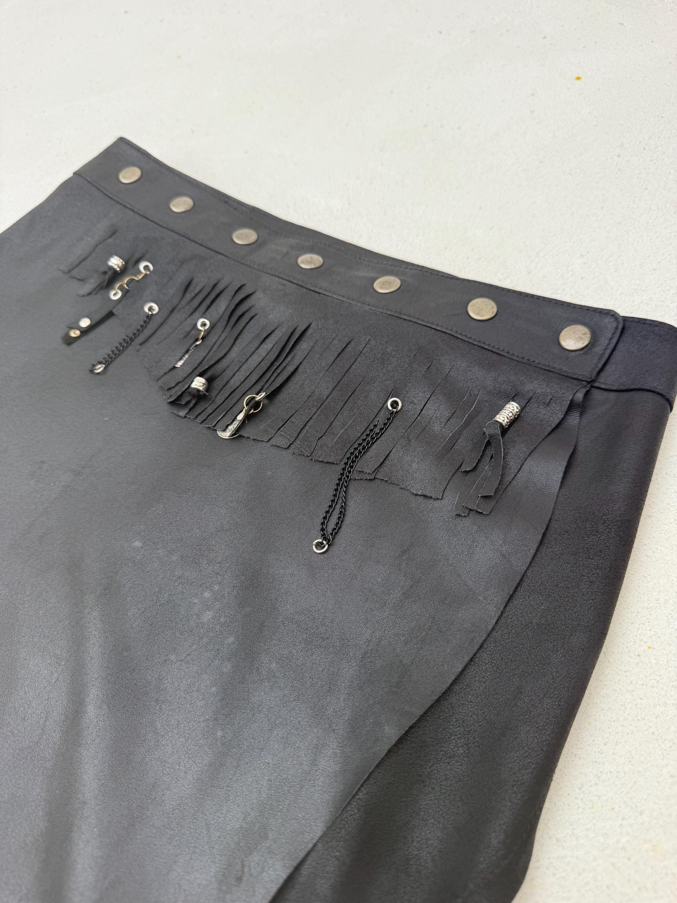 The Midnight Drifter is made of a curated butter soft leather wrap skirt, hand transformed with fringes, silver studs & coins. It closes with adjustable snaps so will fit any size.