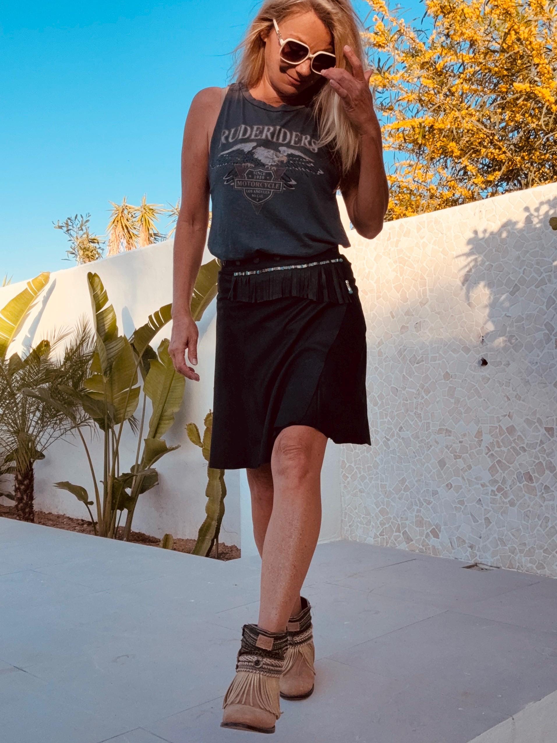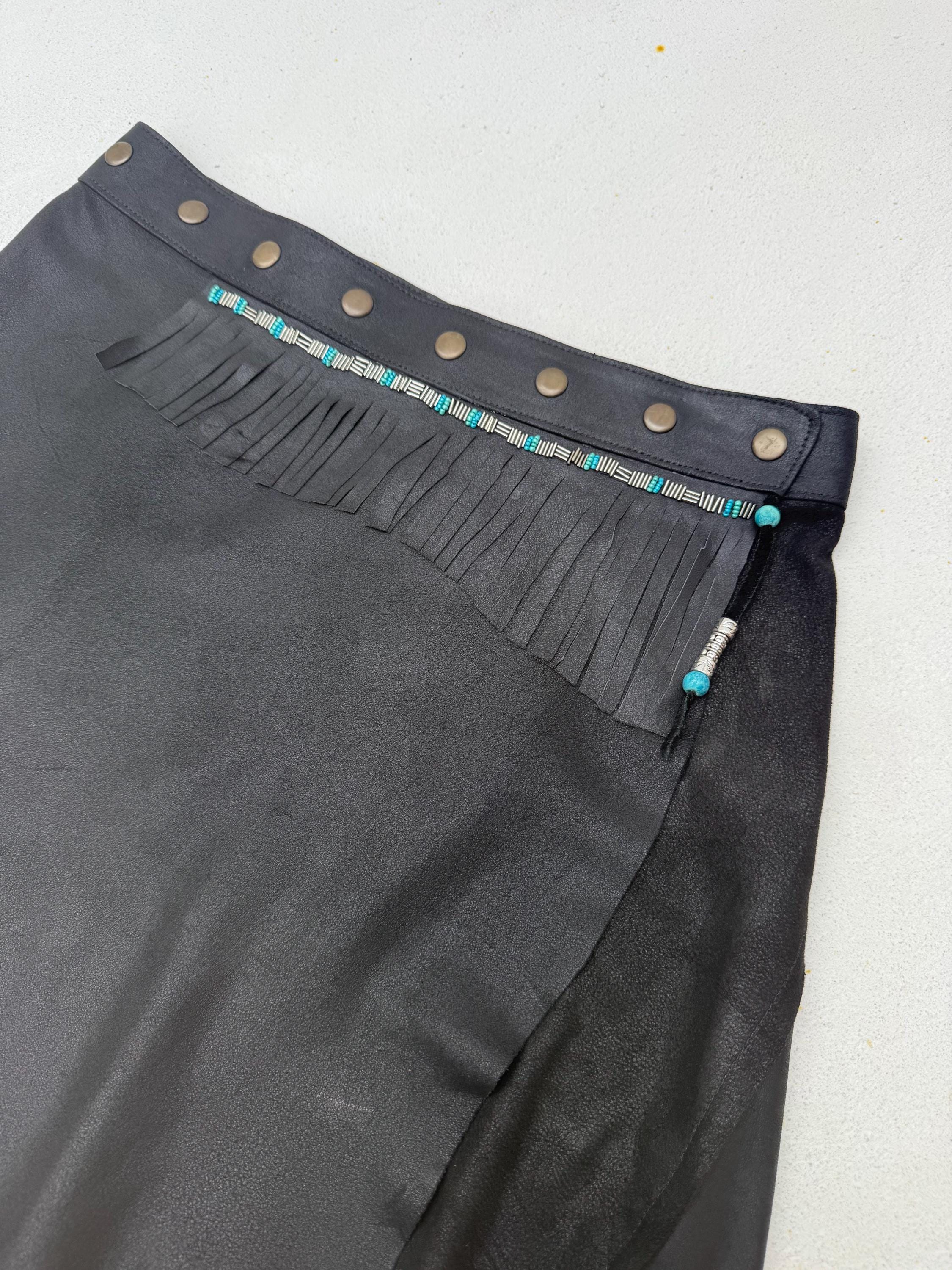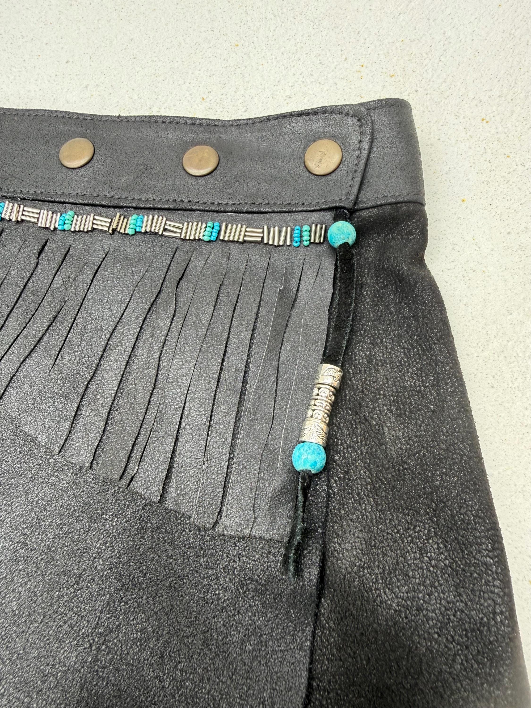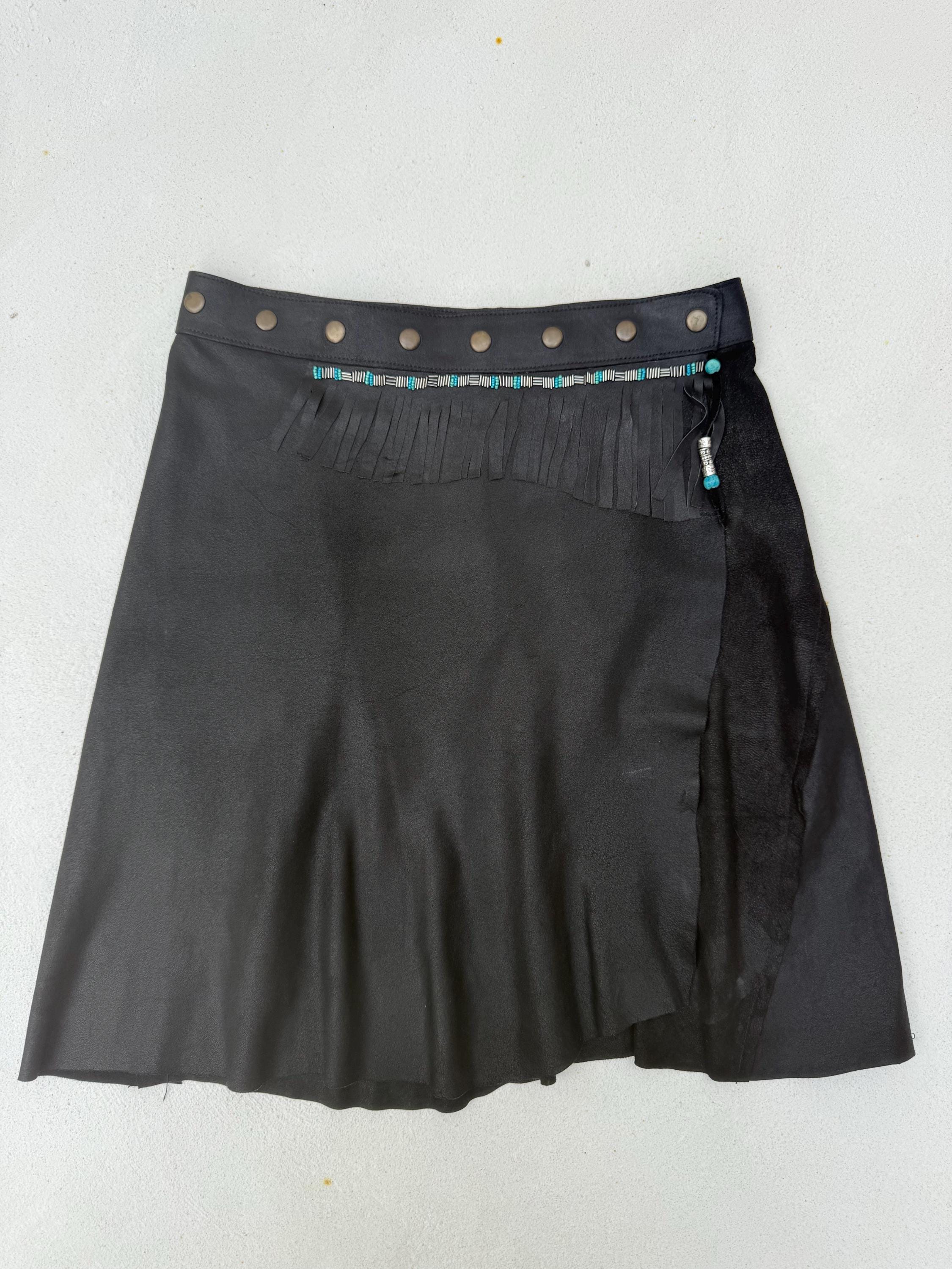 The Shadow Voyager is made of a curated butter soft leather wrap skirt, hand transformed with fringes and navajo inspired beads. It closes with adjustable snaps so will fit any size.