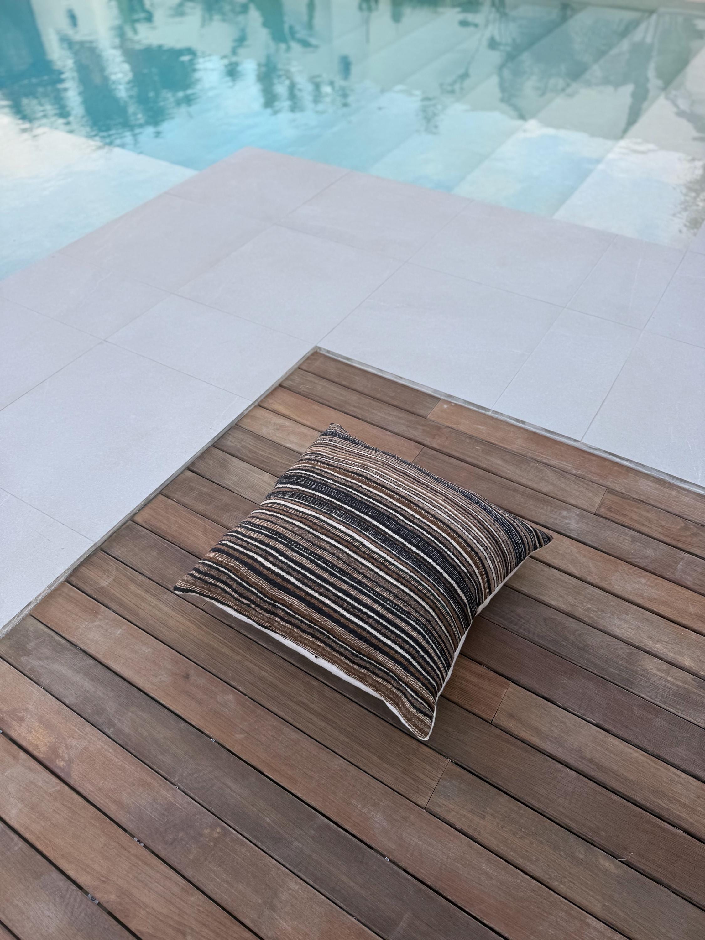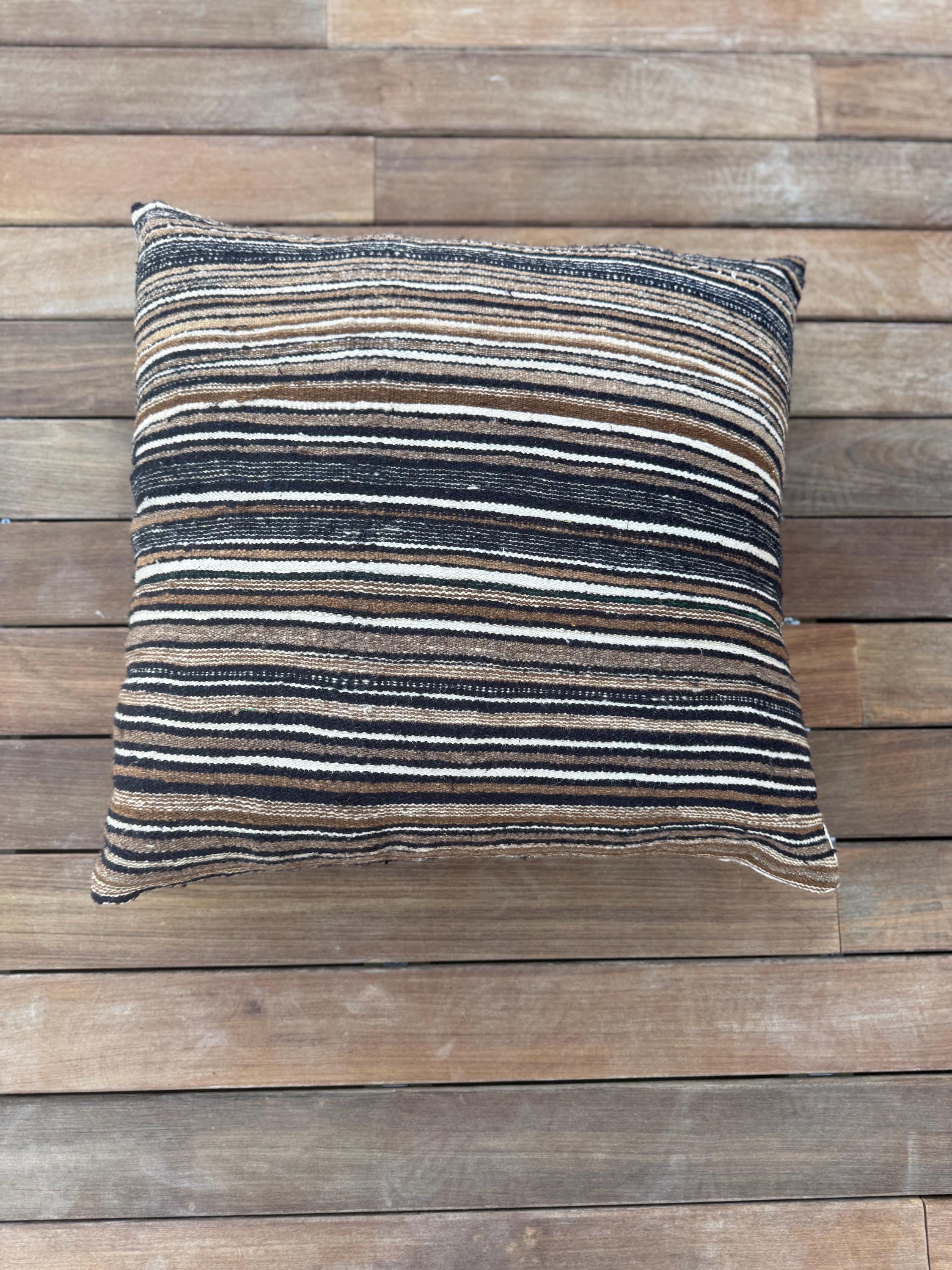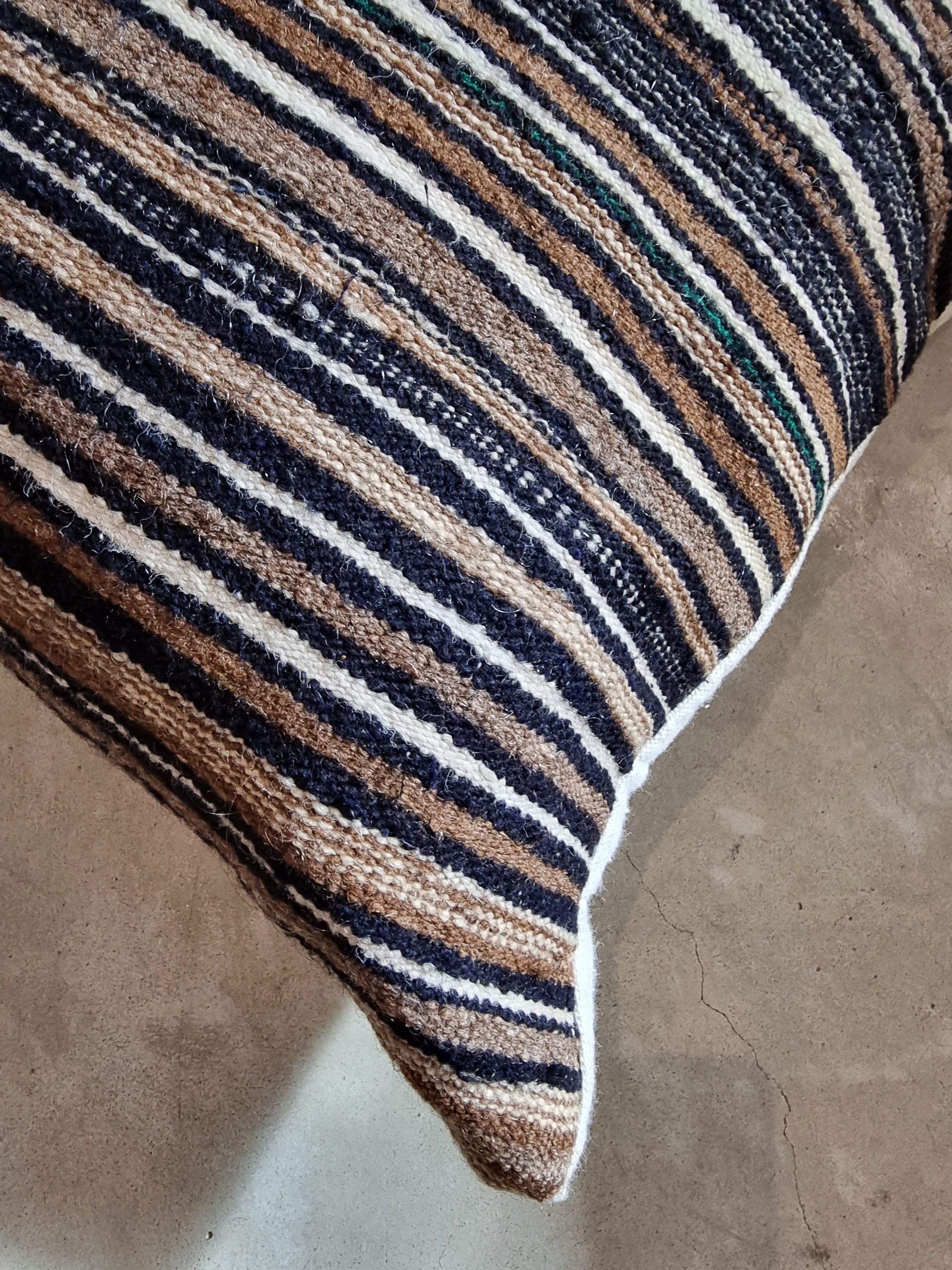 This one of a kind cushion cover brings warmth, texture and quiet character into your space. Crafted from a beautifully striped textile in earthy tones - deep browns soft creams and faded blacks - it carries a subtle, almost tribal rhythm that feels both grounded and timeless.