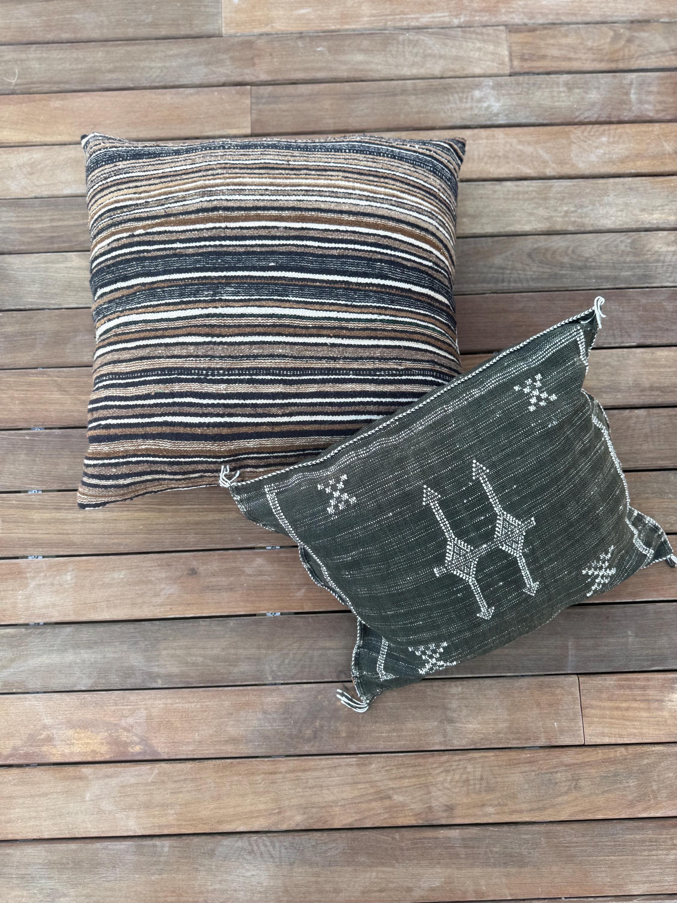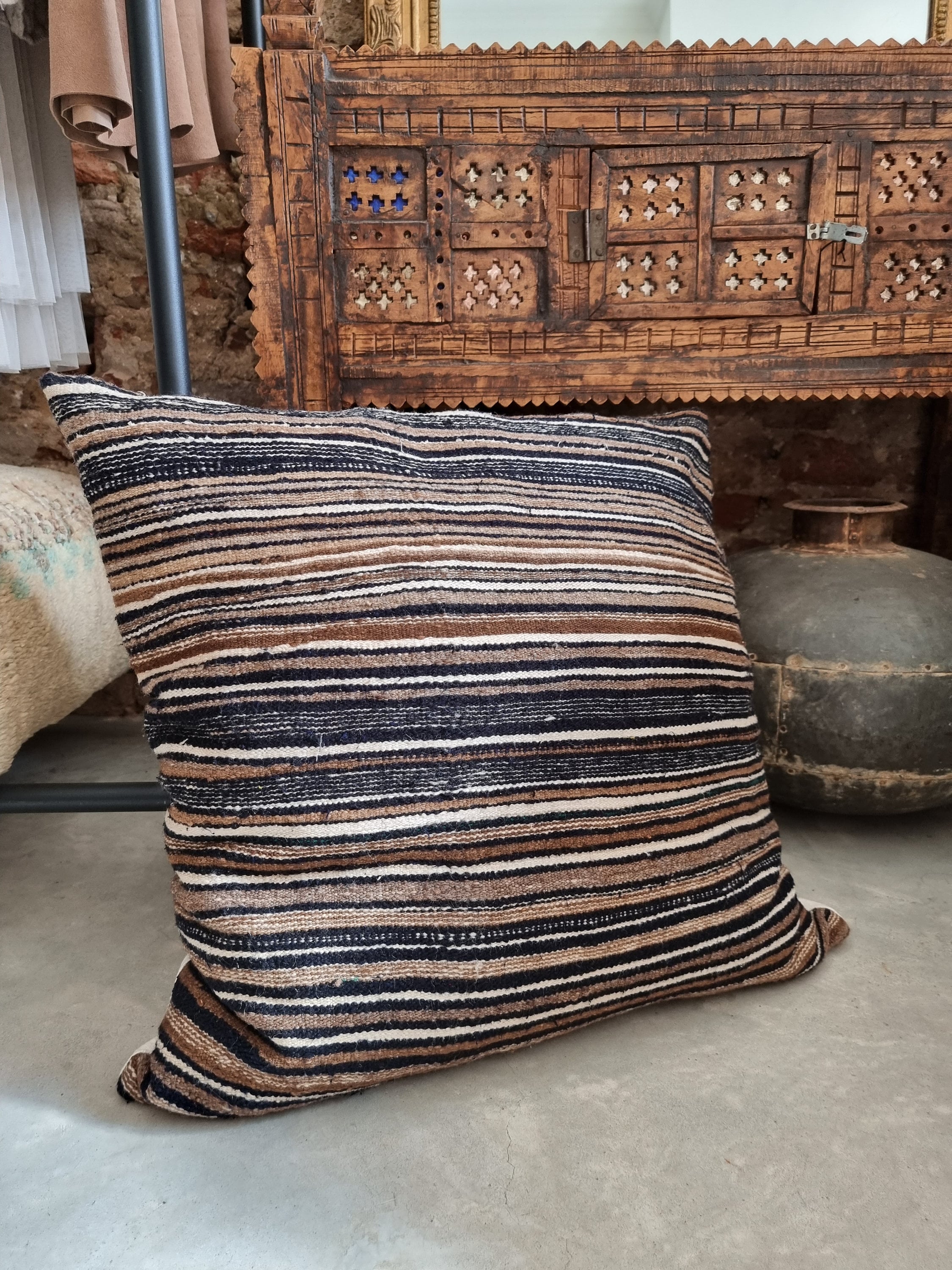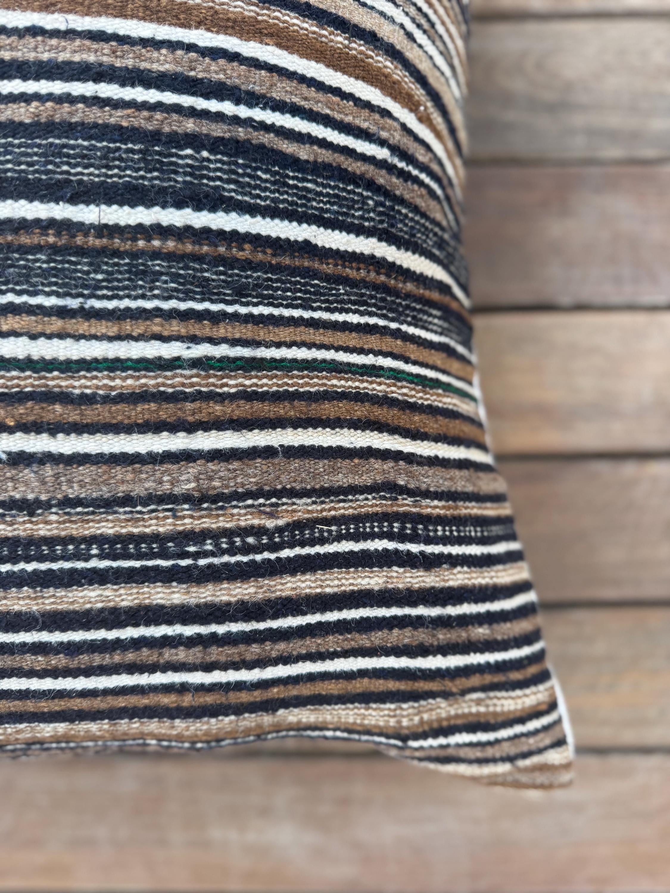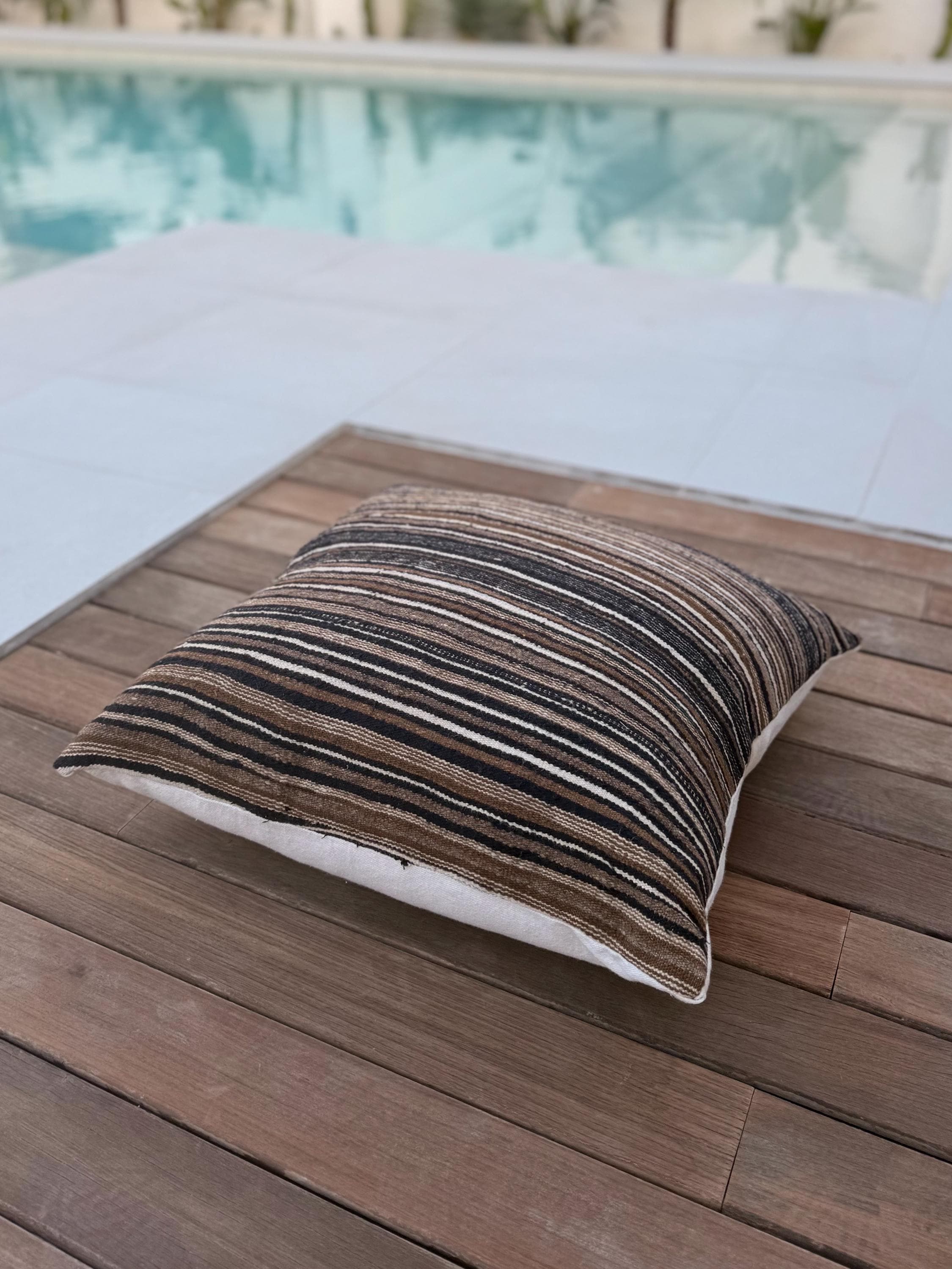 This one of a kind cushion cover brings warmth, texture and quiet character into your space. Crafted from a beautifully striped textile in earthy tones - deep browns soft creams and faded blacks - it carries a subtle, almost tribal rhythm that feels both grounded and timeless.